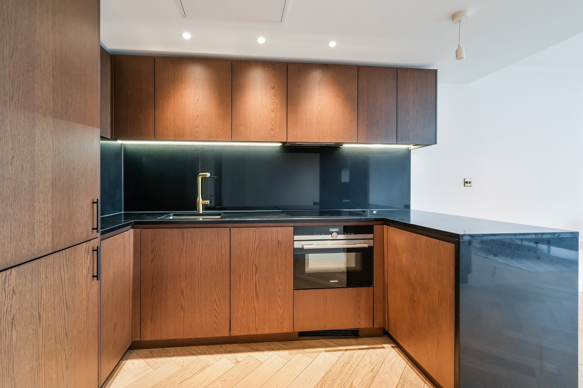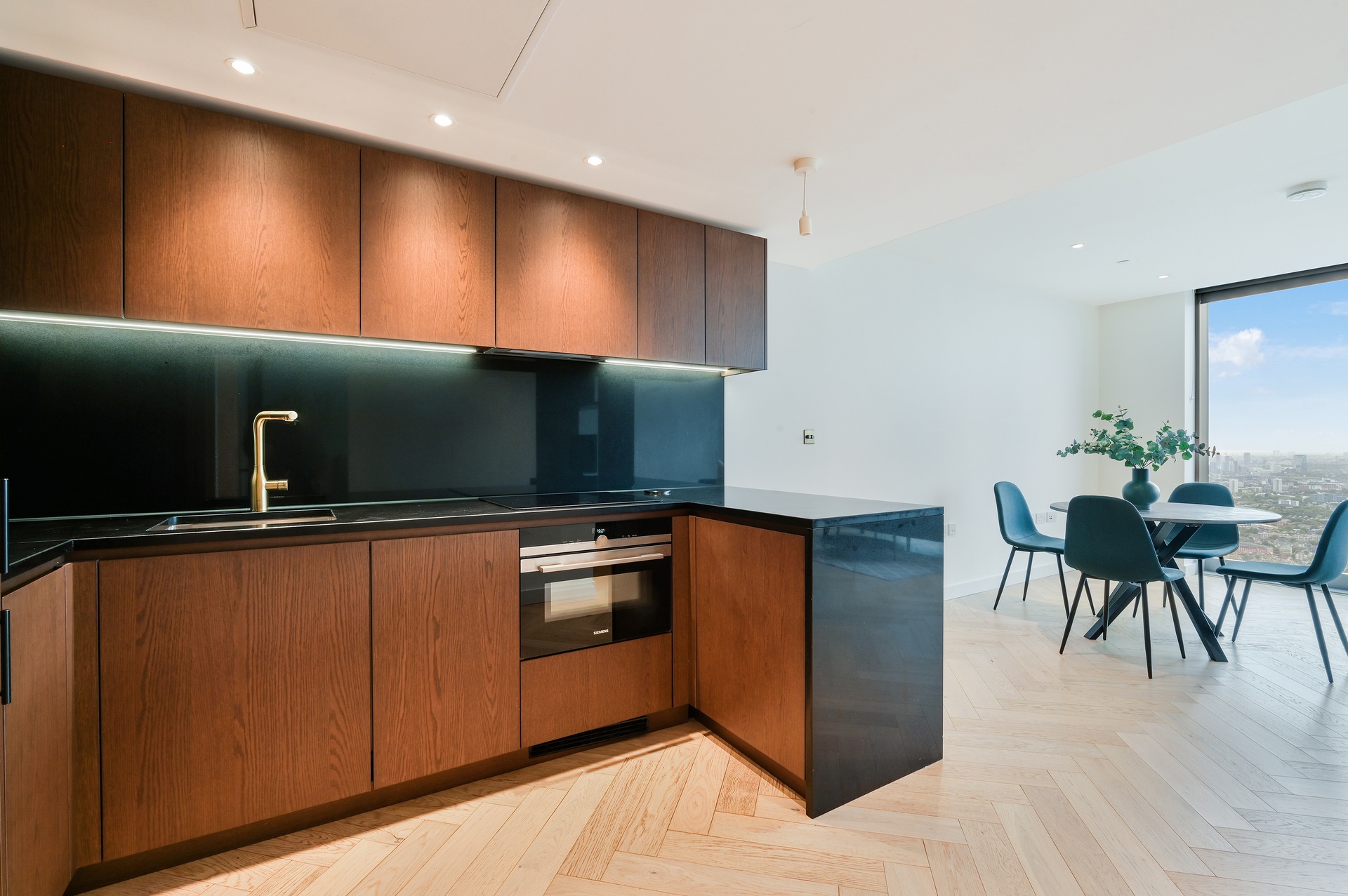 The sleek U-shaped kitchen is both stylish and functional, complete with a breakfast bar and fully integrated appliances—perfect for modern city living and effortless entertaining. Carefully considered storage solutions are incorporated throughout, ensuring a refined yet practical living experience.