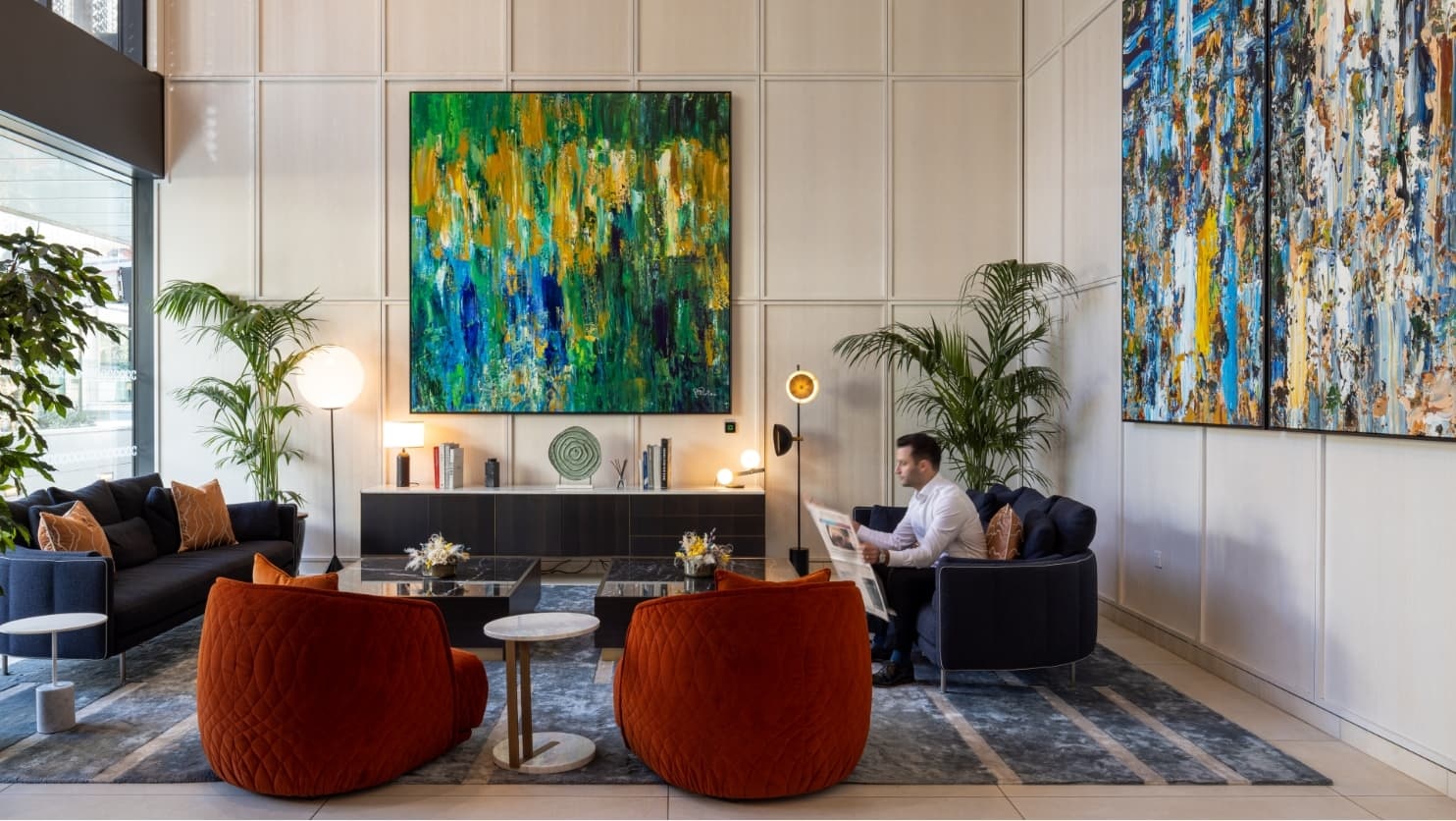 Residents enjoy access to a state-of-the-art gymnasium on the 56th floor, alongside an elegant residents’ lounge designed for both relaxation and socialising. A private cinema room, games room, and virtual golf suite further enhance the living experience, while the spectacular rooftop terrace on the 75th floor provides a tranquil escape with panoramic city views.