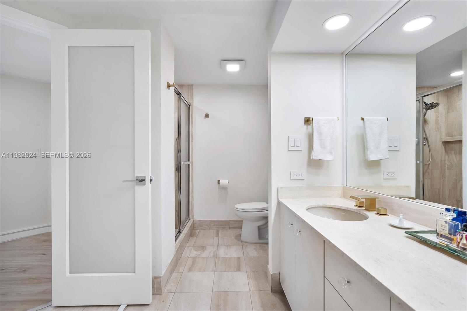 This expansive 1,622 sq. ft. condo boasts a thoughtfully designed split floor plan, offering 2 spacious bedrooms and 2 beautifully updated bathrooms. The completely remodeled kitchen, featuring modern finishes, opens seamlessly to the living area, making it perfect for both relaxing and entertaining. Luxury vinyl flooring adds warmth and style, while custom-built closets provide smart storage solutions. LED recessed lighting, smooth ceilings, and a brand-new A/C (installed in 2025) complete this impeccably maintained space.