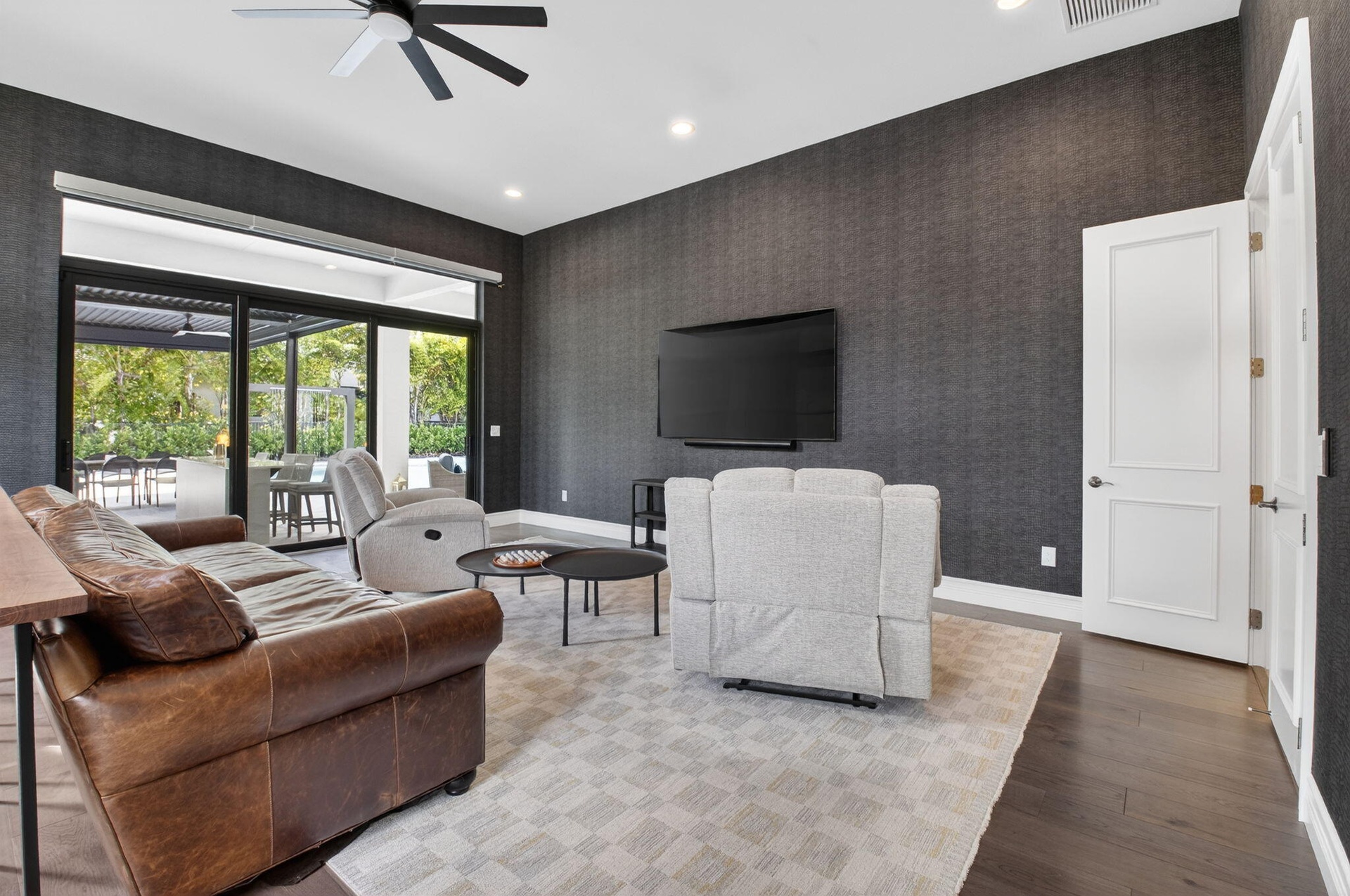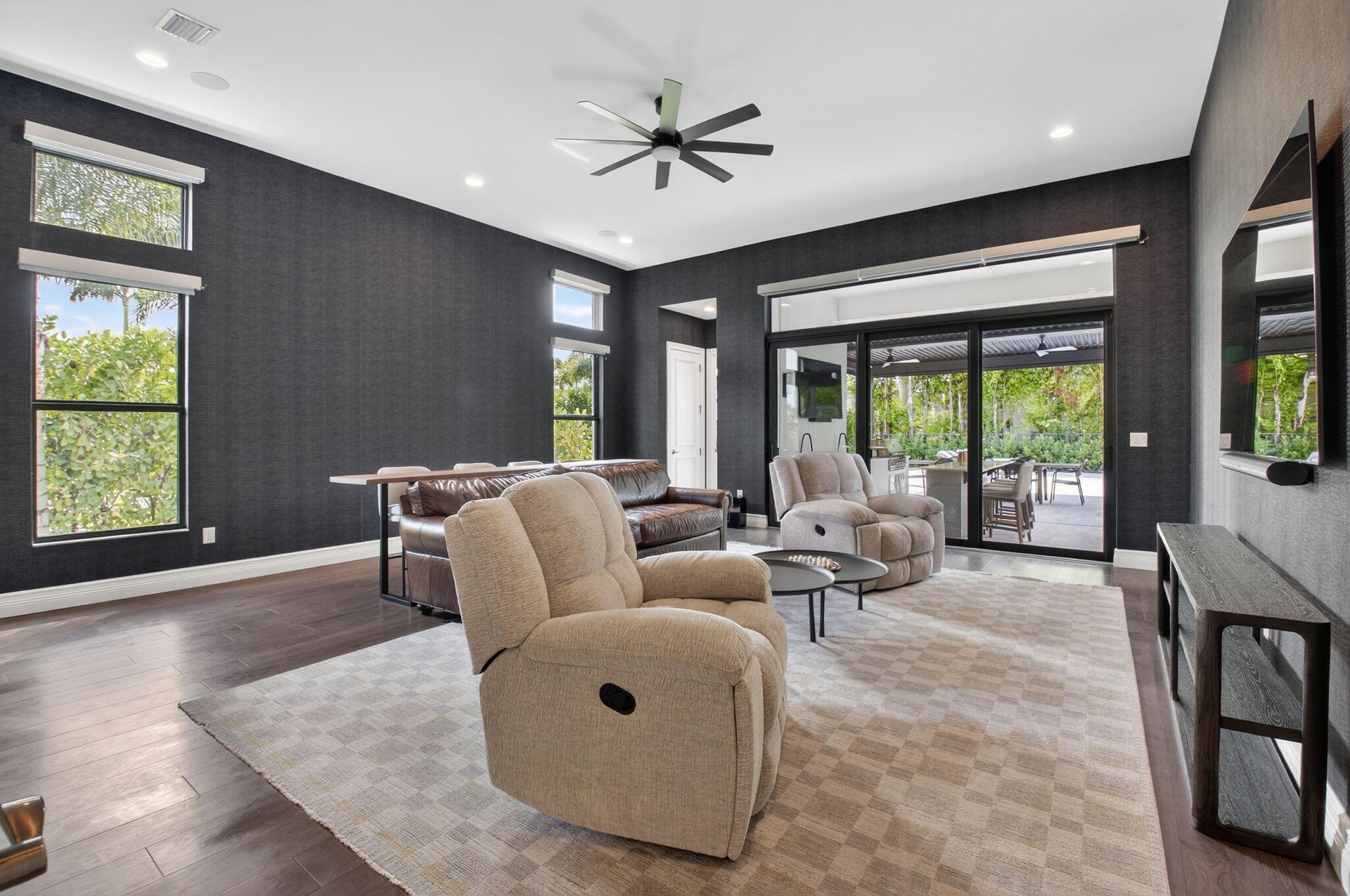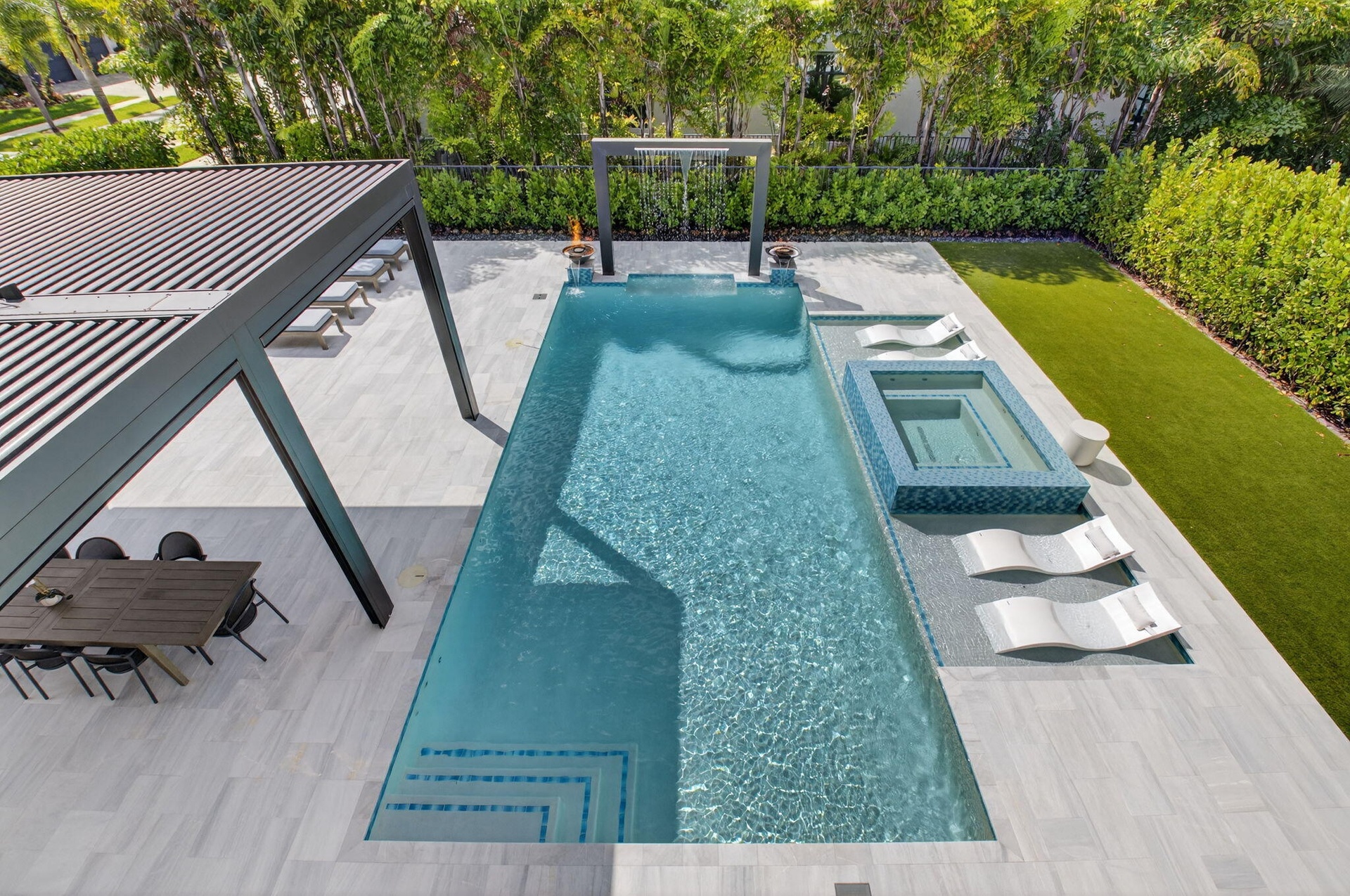 This stunning Riverside model with a coastal transitional elevation showcases exceptional design, thoughtful upgrades, & a beautifully curated indoor-outdoor lifestyle. Original enhancements include a resort-style outdoor oasis, creating a private retreat ideal for entertaining & relaxation. The backyard features a fully equipped outdoor kitchen, artificial turf, decorative fountains, & lush professional landscaping, along with a custom pergola with adjustable louvers offering both sun & shade throughout the day. Additionally this home has been significantly upgraded with extensive architectural & designer features throughout: a striking glass staircase, custom wall moldings in the foyer & staircase, & an illuminated coffered ceiling. Furnishing is negotiable. Exclusions that would apply are white couch in family room and all beds in the upstairs bedrooms.