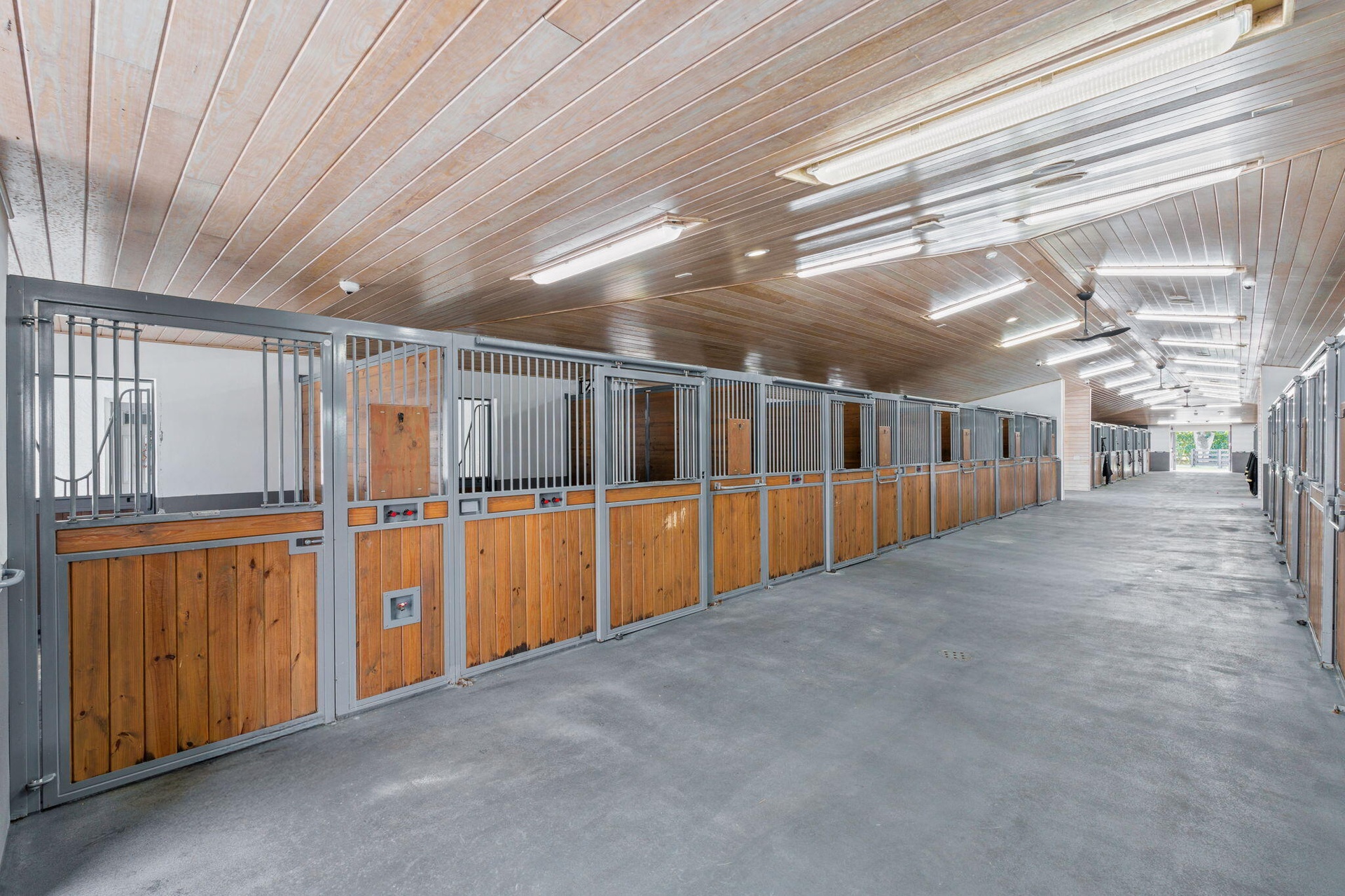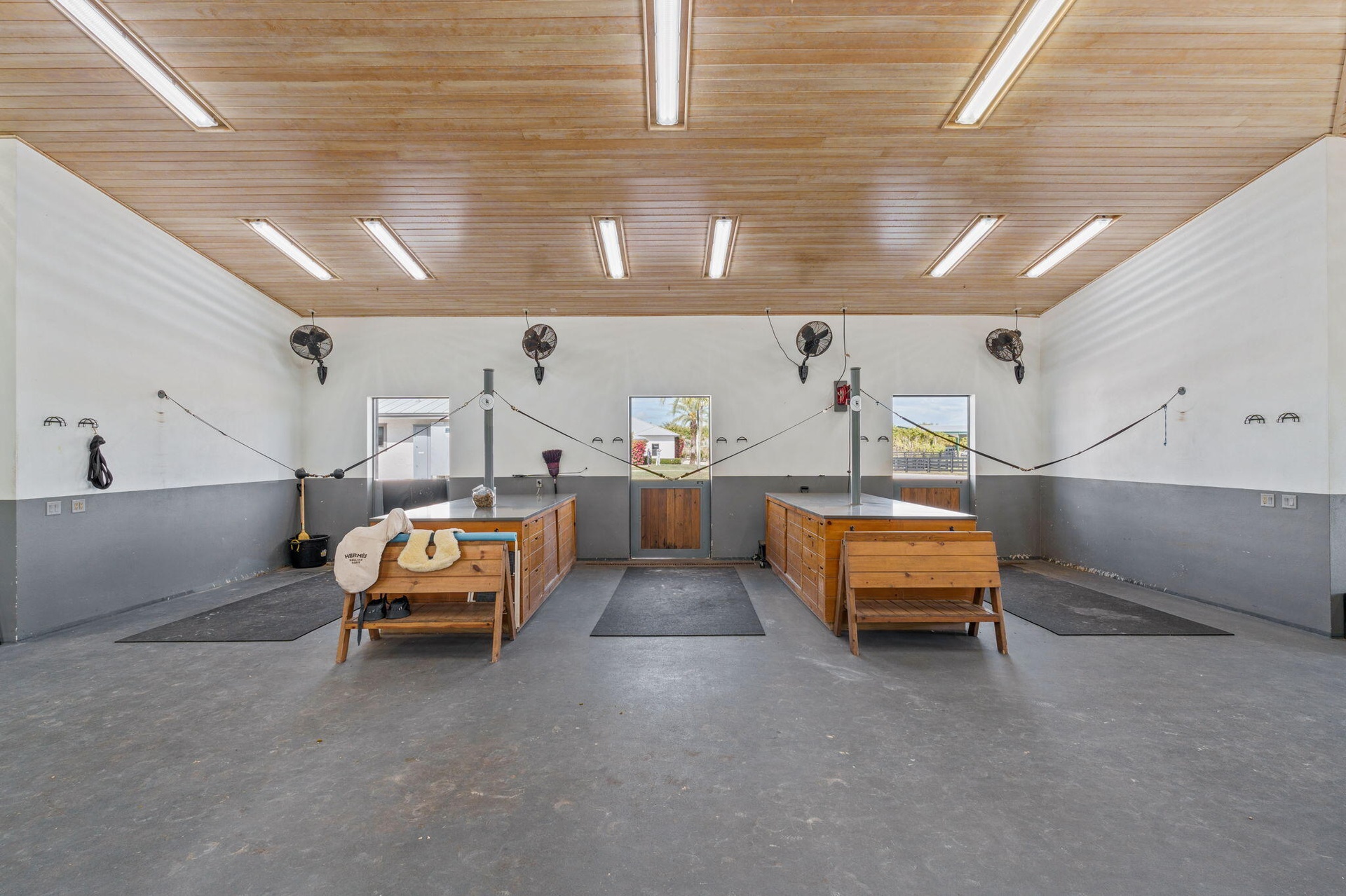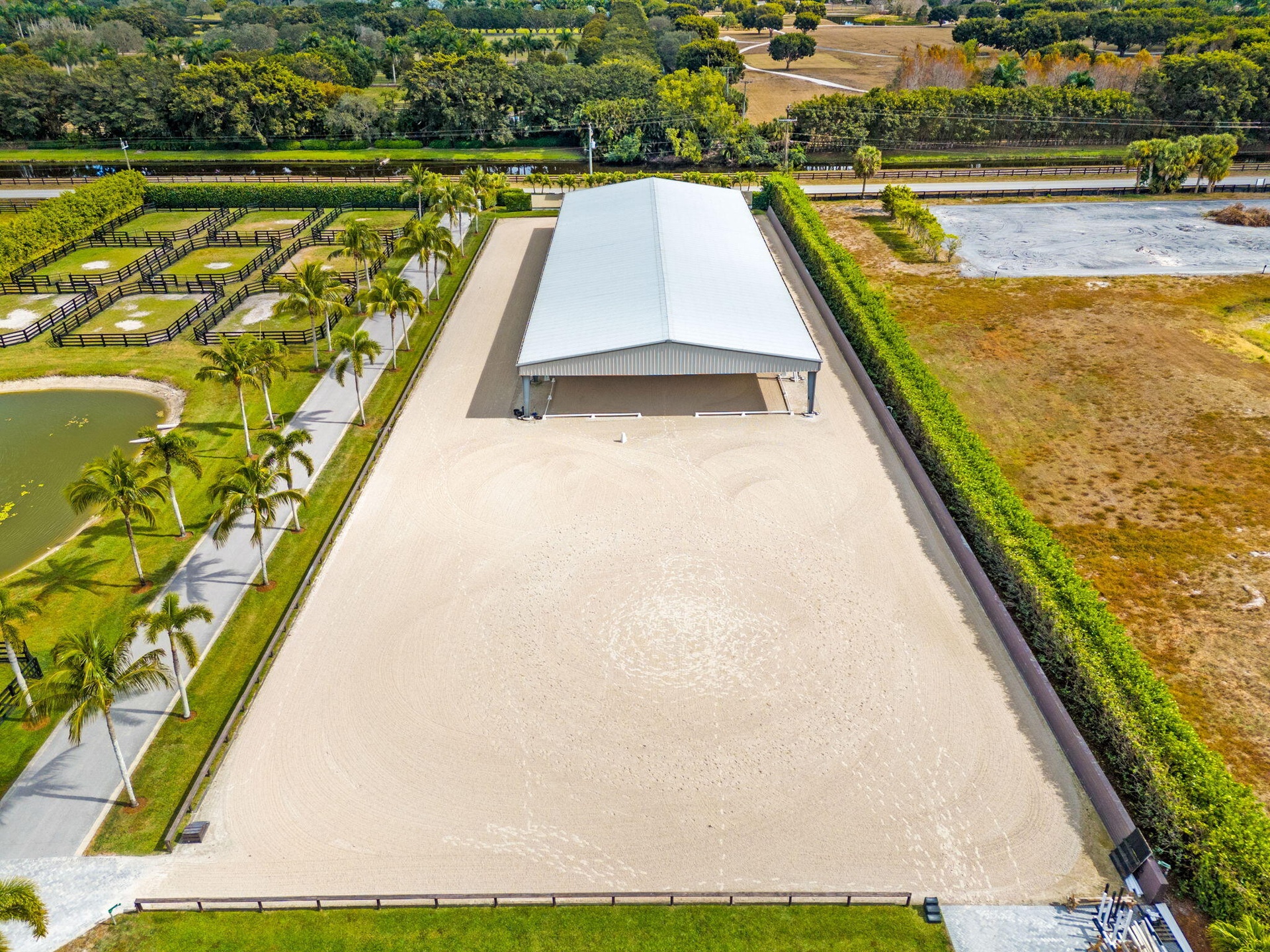 Tucked away in a quiet, secluded setting yet optimally positioned near the horse show, this exceptional farm offers the rare combination of privacy and convenience. From the moment you pass through the gates, it is clear this is a special property, framed by lush bougainvillea and beautifully curated landscaping that feels both welcoming and picturesque. Spanning just over 5 acres, the farm is thoughtfully designed and impeccably maintained. A standout feature is the oversized mirror arena, mostly covered and equipped with all-weather fiber footing, making it ideal for year-round training. The property includes 38 total stalls, with a 24-stall main barn featuring a center aisle and 14 additional stalls in a separate rear center-aisle barn. Abacus cushion stall flooring Abacus cushion stall flooring provides exceptional comfort, and the stalls feature Dutch doors that allow horses to look out. Tongue-and-groove finishes, generous storage throughout, and well-planned workspaces elevate both function and aesthetics. The layout is unlike most barns and offers a highly functional, flexible design. One side is fully owner-oriented and equipped with all amenities, while the opposite side offers a flexible configuration that can accommodate private facilities with separate workstations and tack rooms, alongside shared amenities including grooming and work areas, a feed room, and laundry, well-suited for multiple training operations. Additional amenities include a hot walker, round pen, 16 paddocks, and a fully fenced perimeter with mature clusia hedging. A shared pond provides irrigation, enhancing both sustainability and the striking façade of the property. The farm is set up for easy truck and feed delivery with a proper turnaround area and includes a hurricane-rated roll-down outbuilding. The property is supported by a full-property generator and offers four apartments, including two newly updated one-bedroom units and two studios, providing flexibility for staff or guests. With ample parking, thoughtfully separated work areas, and a picturesque setting, this farm blends beauty, efficiency, and top-tier equestrian functionality, all just a short hack to the horse showgrounds.