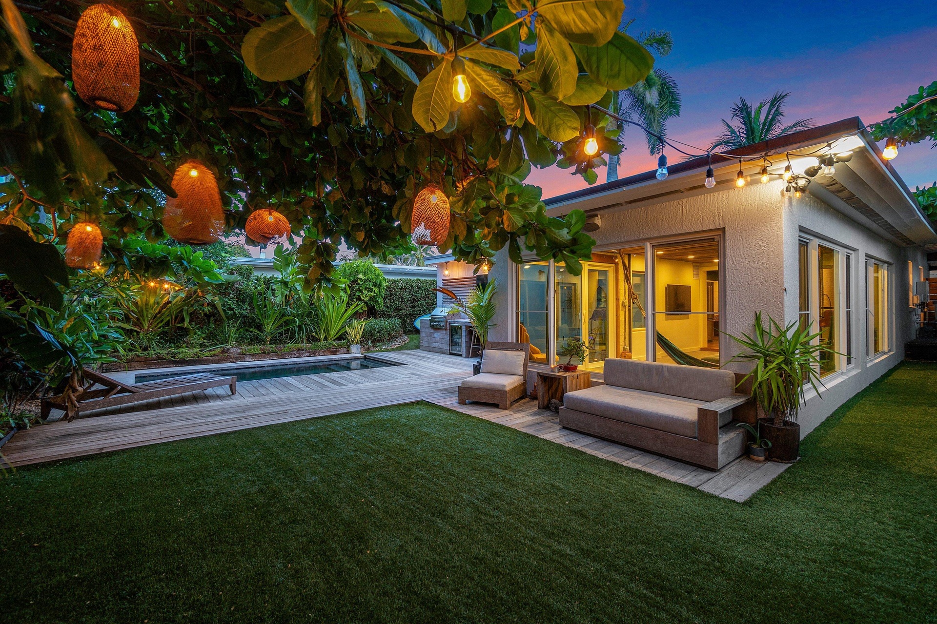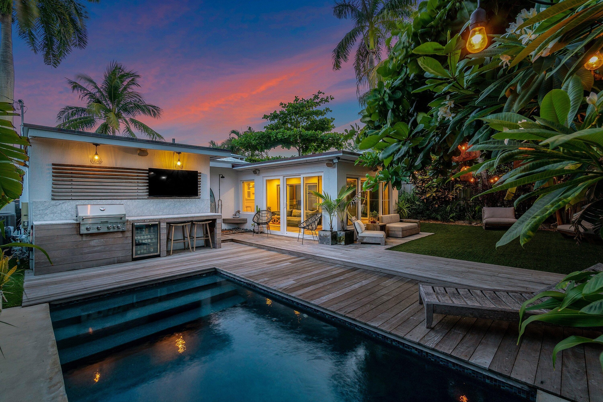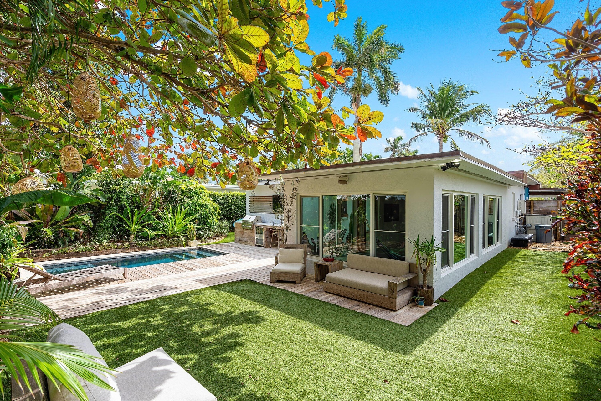 Modern Tropical Bungalow moments away from the Intracoastal Waterway in the coveted Northwood Shores. This completely renovated, turn-key home features solid hardwood and polished concrete floors. 2BR/2BA with an open-concept layout. An oversized Florida room opens to a heated saltwater plunge pool with Ipe wood decking, outdoor shower, and lush tropical landscaping. The outdoor entertaining area is complete with a Carrera marble countertop, built-in gas grill, and wine refrigerator. Interior highlights include KitchenAid appliances, Caesarstone countertops, a gas range, and reclaimed white oak cladding. Convenient to beaches, downtown, NORA, and Palm Beach Island.