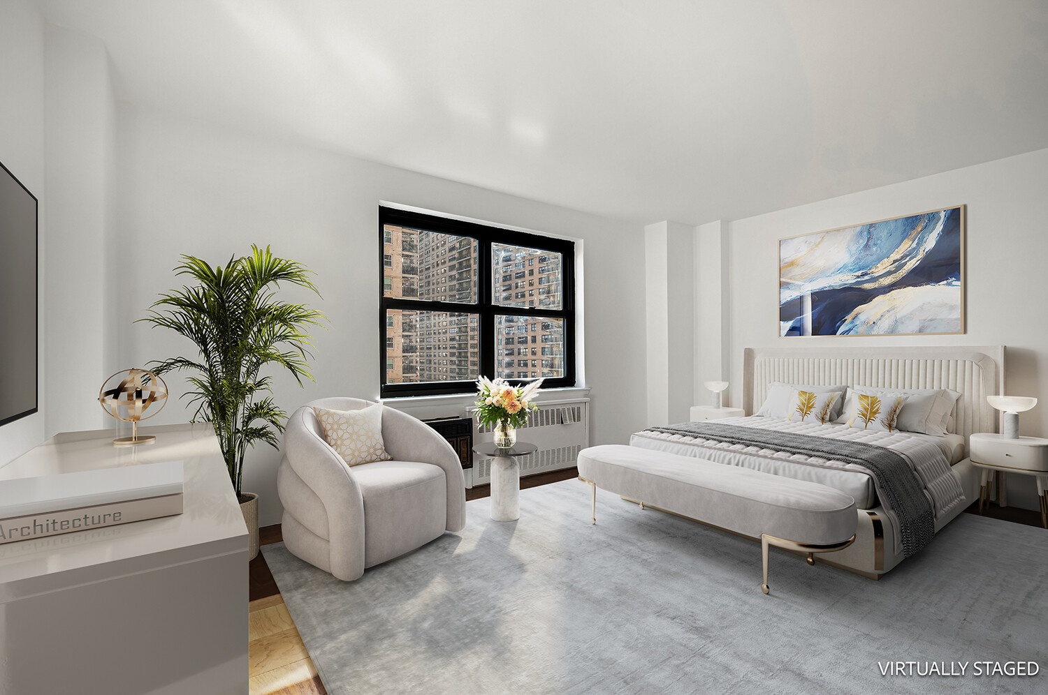15J is a bright, east facing, high floor one bedroom home, located at the front of the building, with open views of sky, city, and trees.