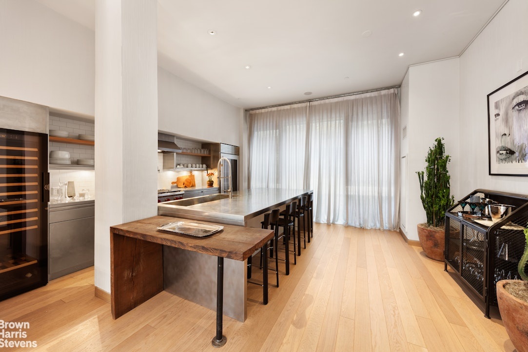 Pure aesthetic reveals itself in the newly designed, eat-in chefs kitchen. Counters are clad in stainless steel as is the custom made gigantic 9.5 foot by 5.5 foot island with fully integrated 45" x 18" dish drain sink. Full height backsplash is white subway tile with wood and stainless finishes. Immaculate design includes: Wolf range, complete with pot filler and Sub-Zero appliances: full size glass refrigerator, matching wine storage (140+) and old school separate ice maker. Full height glider drawers and open shelving provide quick easy access. Misc: white oak floors throughout. Sound system installed.