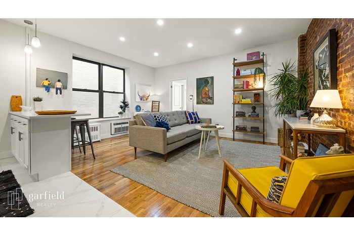 The expansive living room features an exposed brick wall and offers ample space for both living and dining, with plenty of room for a desk as well. The open kitchen has been tastefully updated with white cabinetry, stainless-steel appliances (including a gas range, dishwasher, and built-in microwave), stone countertops, a breakfast bar, and a stylish tile backsplash. The bright and airy bedroom is generously sized and offers excellent closet space. The windowed bathroom is crisp and clean. Additional highlights include high ceilings, refinished hardwood floors, and new in-wall air conditioning.