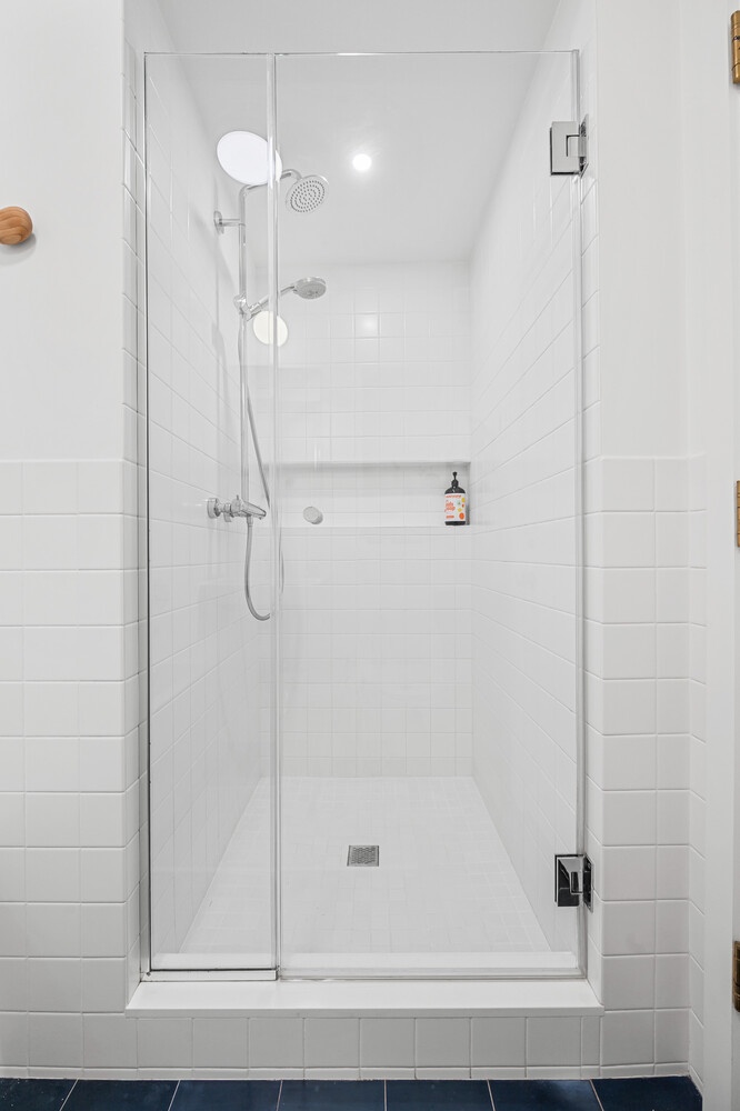 The crisp tiled bathroom includes a deep soaking tub and a separate stall shower, Hansgrohe fixtures, a wall-mounted toilet, mirrored medicine cabinet, and heated floors-classic, clean, and comfortable.