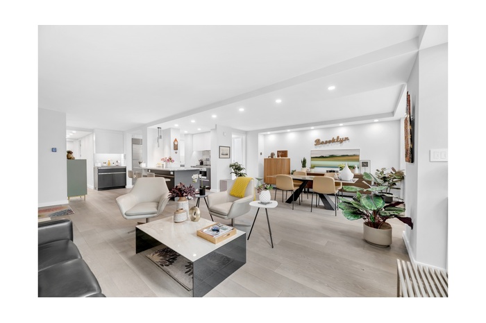 Beautifully laid out, the residence offers exceptional scale, functionality, and flow, with distinct living and sleeping wings that create the perfect balance between entertaining and everyday comfort. A gracious foyer opens into an expansive living and dining room, where oversized windows flood the space with natural light. With both eastern and southern exposures, sunlight pours into the home throughout the day. Just beyond, the chef's kitchen is thoughtfully designed with abundant counter space and an island with seating. High-end appliances include a Sub-Zero refrigerator, Wolf oven, five-burner cooktop, built-in microwave and exhaust. From the stunning countertops and backsplash to the exceptional lighting and flooring, every detail has been carefully considered.