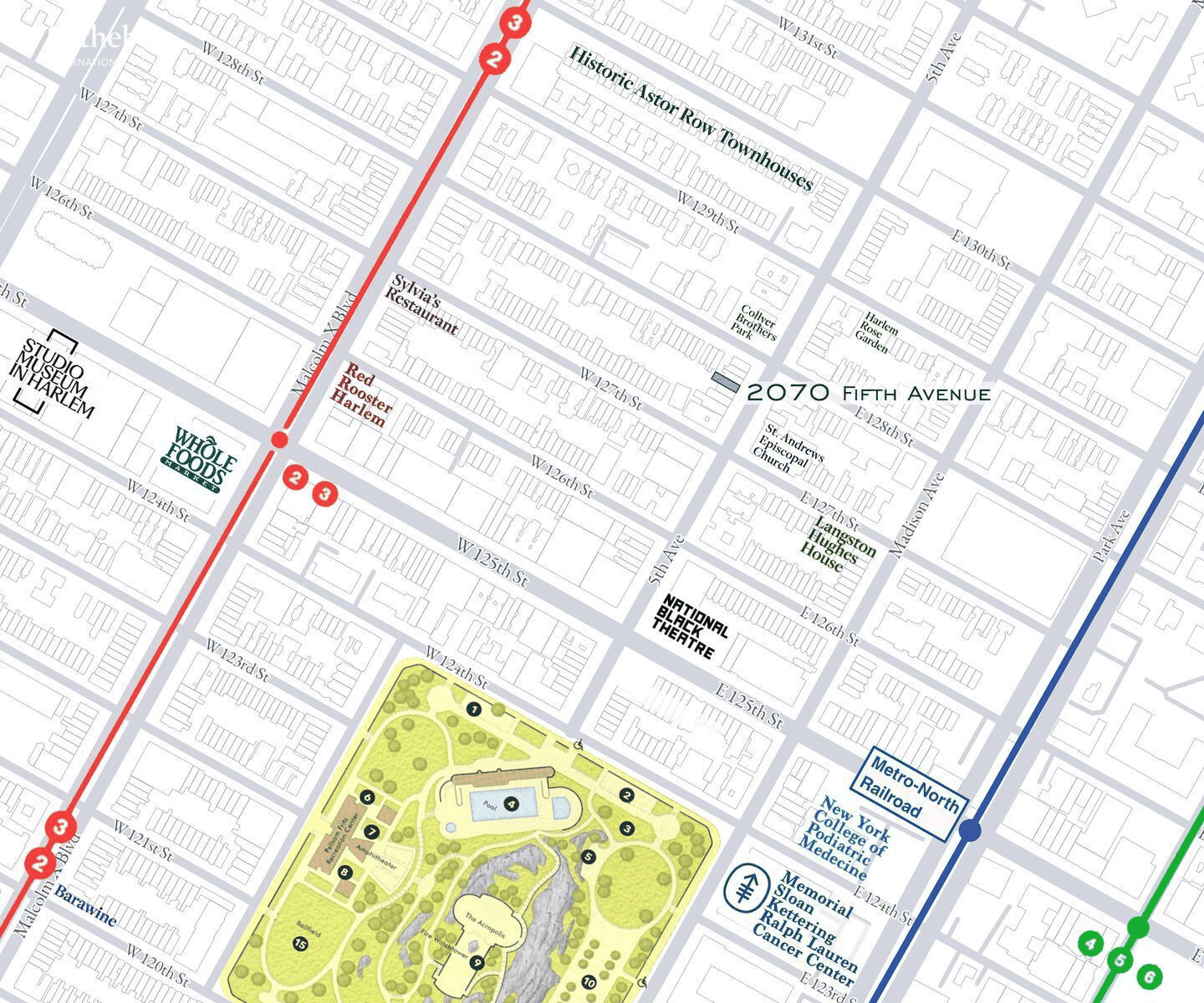 Located in the heart of Central Harlem, 2070 Fifth Avenue is moments from Whole Foods, Sylvia’s, and Red Rooster, as well as the newly reopened Studio Museum in Harlem. Mount Morris Park, the National Black Theatre, and the historic Astor Row townhouses are all nearby, placing the property within one of Manhattan’s most vibrant residential settings.