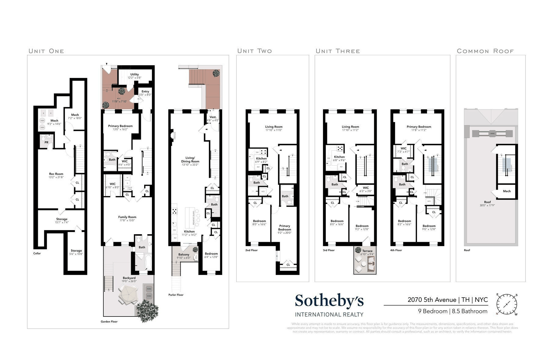 The building contains approximately 5,200 square feet above grade and roughly 6,324 square feet in total including a finished cellar, along with approximately 1,400 square feet of outdoor space across the front yard, rear yard, terrace, deck, and roof. Currently configured as three residences, the property presents multiple avenues for ownership, income generation, or future single-family conversion.