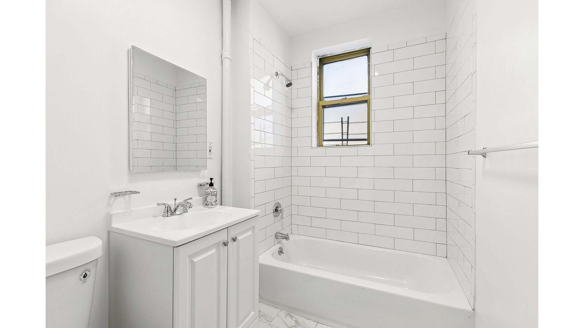 The bathroom is a serene retreat, with a window that invites natural light to enhance your daily routine, whether it's a quick morning refresh or a leisurely evening soak.