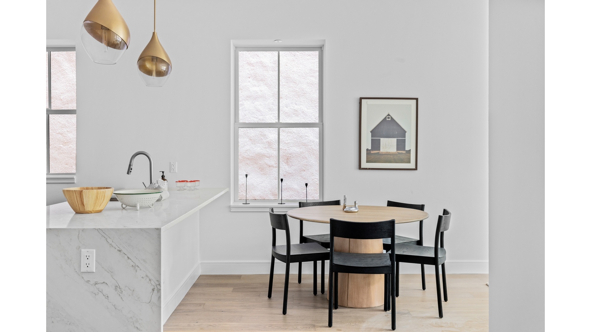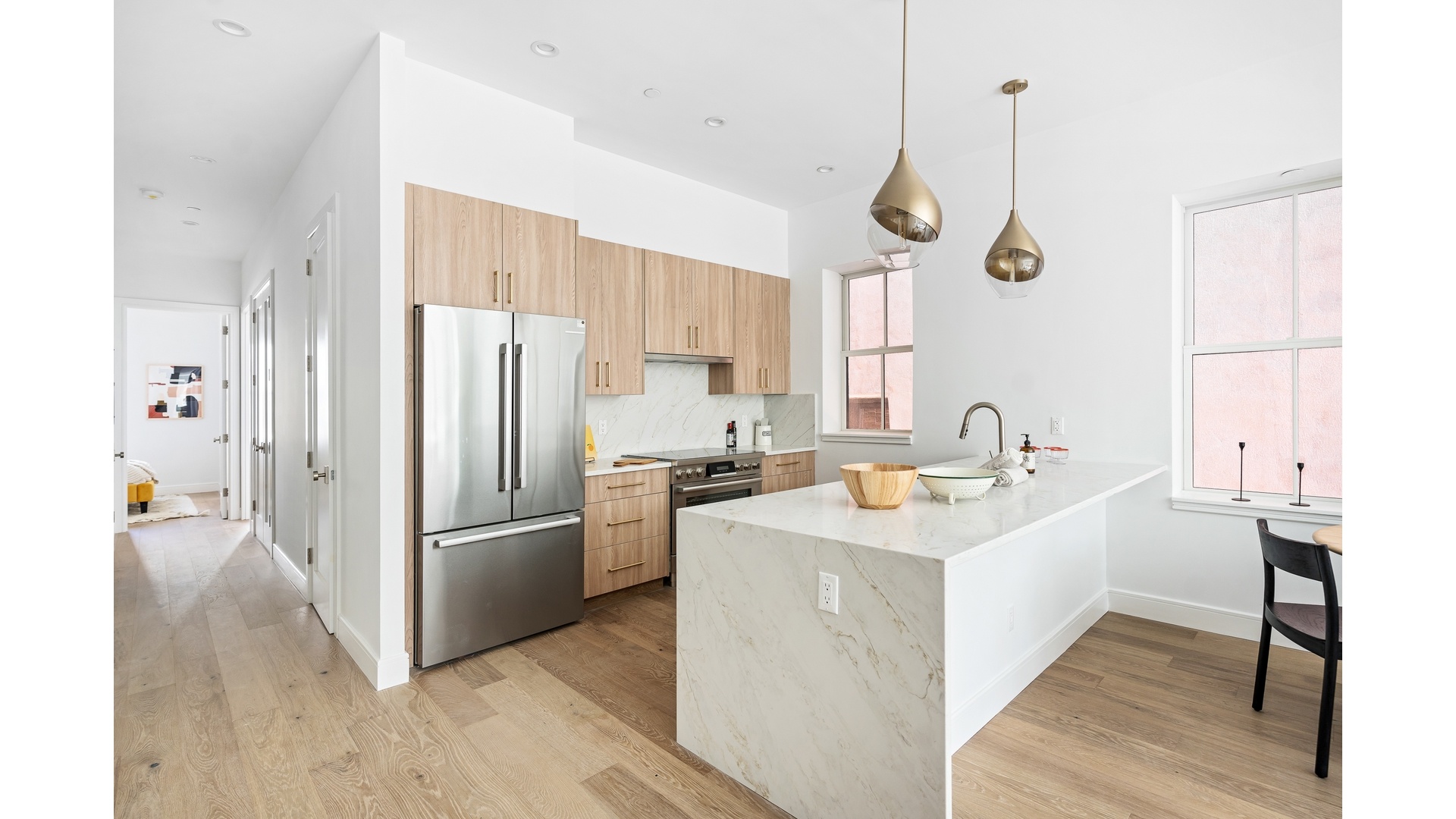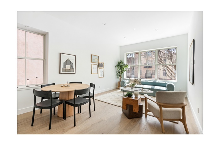 Each residence offers private, floor-through layouts with private outdoor space that extends the living areas, creating serene retreats for relaxation or entertaining. Inside, each home is outfitted with a refined palette of materials that blend modern sophistication with organic warmth. Environmentally conscious wide-plank white oak flooring adds a grounding elegance, while oversized windows and 10ft ceilings that flood the interiors with natural light create a sense of airiness and flow.