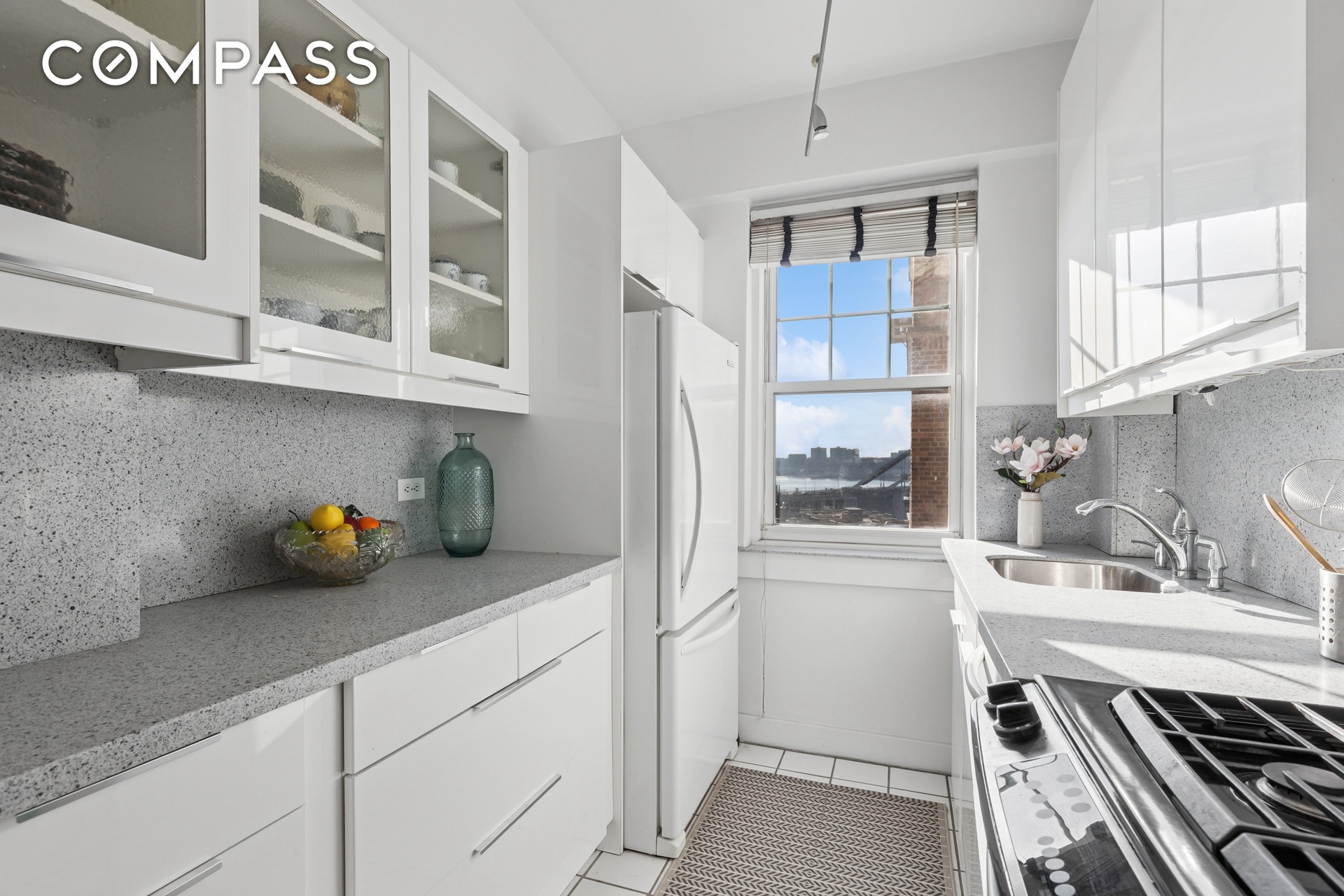 Bright windowed Kitchen with clean white cabinetry with ample storage, gray speckled countertop and backsplash, white square floor tiles, track beam lighting. Appliances include gas range stove/oven, microwave, refrigerator, deep sink, and dishwasher.
