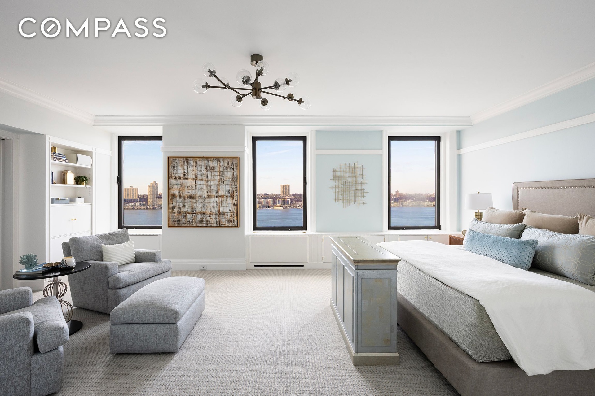 The primary suite is beautifully positioned along the River and enjoys three large west-facing picture windows. It features three custom closets, bespoke built-in window storage, and a luxurious primary bath with double vanity, abundant storage, a walk-in spa shower, Waterworks fixtures, and radiant heated floors. Just outside the primary suite, two additional walk-in closets line the gallery, offering exceptional storage.