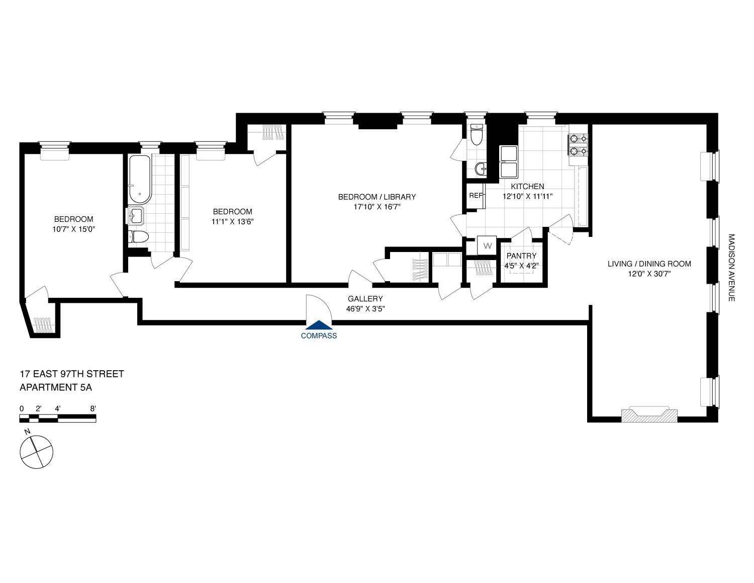 This corner unit offers 11 windows and beautifully expansive rooms. A 46-ft-long gallery welcomes you and offers the ideal separation between the home’s entertaining space and the bedroom wing, as well as providing the perfect backdrop for your cherished artwork.