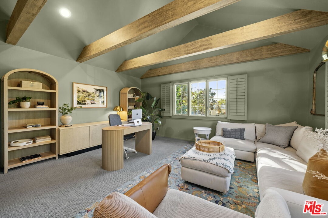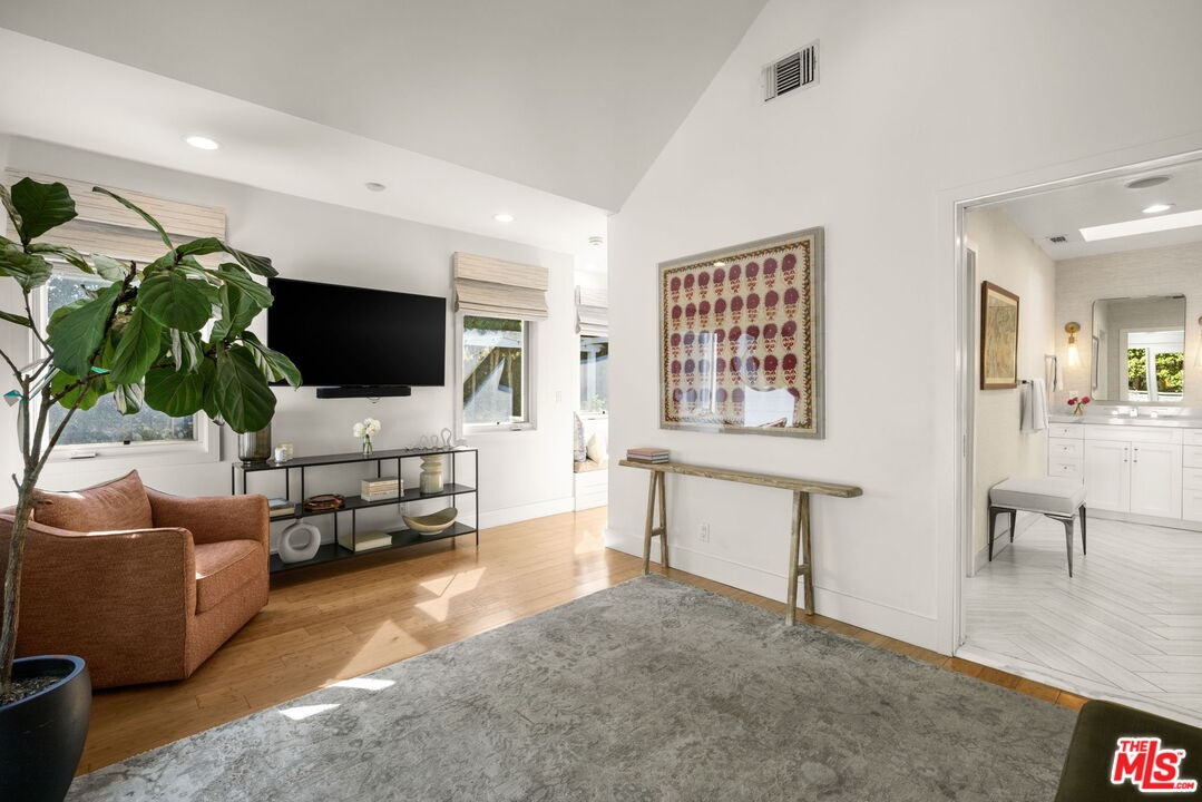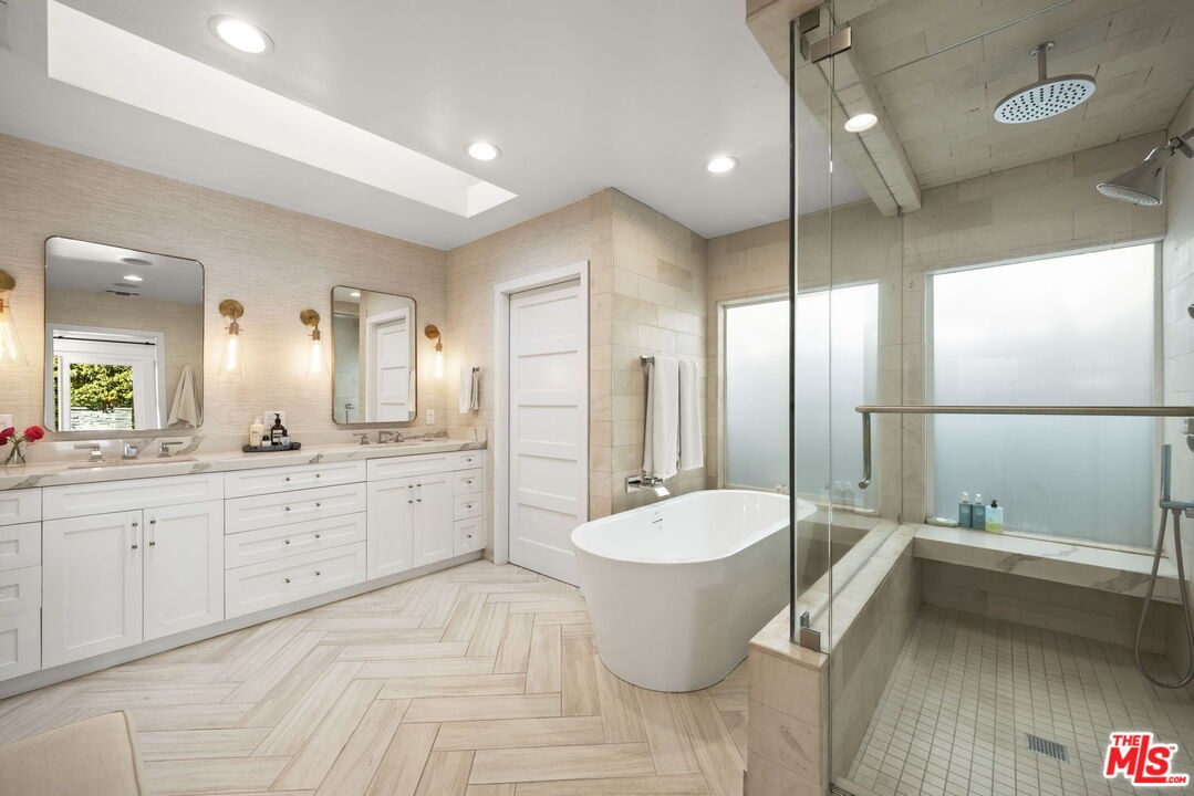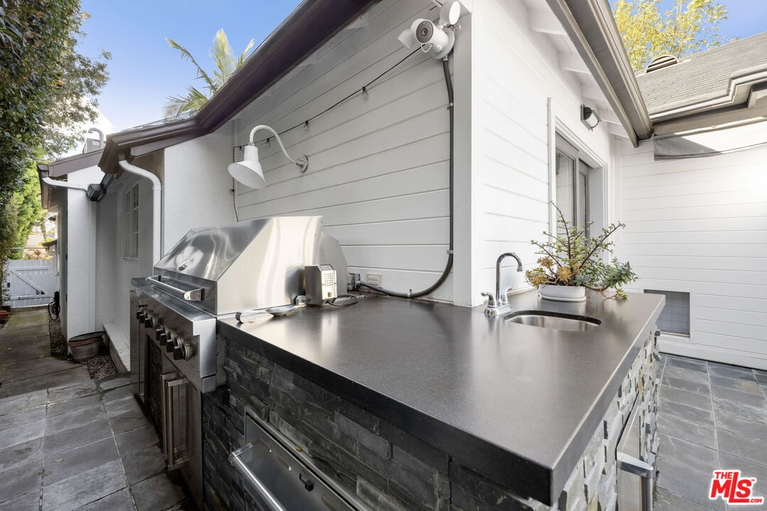 Tastefully updated Brentwood retreat with a rare blend of timeless charm and modern amenities. This bright and airy 3-bedroom home features a versatile upstairs bonus room with a vaulted beam ceiling which is an ideal office, media room or playroom. Gourmet chef's kitchen with stainless steel appliances, a walk-in pantry and a breakfast/dining area which can fit large dinner parties as it is seamlessly integrated into a larger family room-great room with a cozy fireplace. The Primary suite has vaulted ceilings, direct access to the backyard, and a luxurious spa like bathroom with a large walk-in closet. Well proportioned secondary bedrooms with built out closets which share the hallway bathroom. The sun drenched back yard is private and quiet with a tall private hedge, lush landscaping, a gas pit and an outdoor shower. The entertainers deck has a retractable awning, built in bbq, sink, warming drawer, and refrigerator. Additional features include a dedicated office nook, 2 car garage with built-in storage, 2 electric chargers, gated driveway and front yard, alarm system with cameras and surround sound speakers (indoor and outdoor). Located close to restaurants, markets, boutiques and Sunday Farmer's market.
