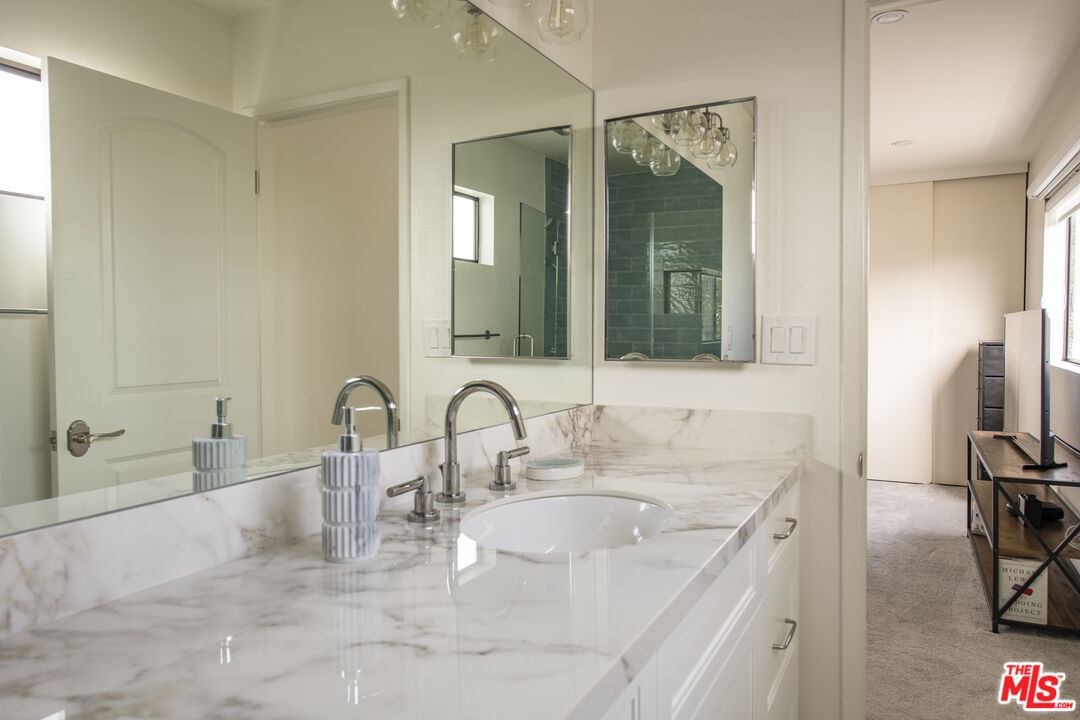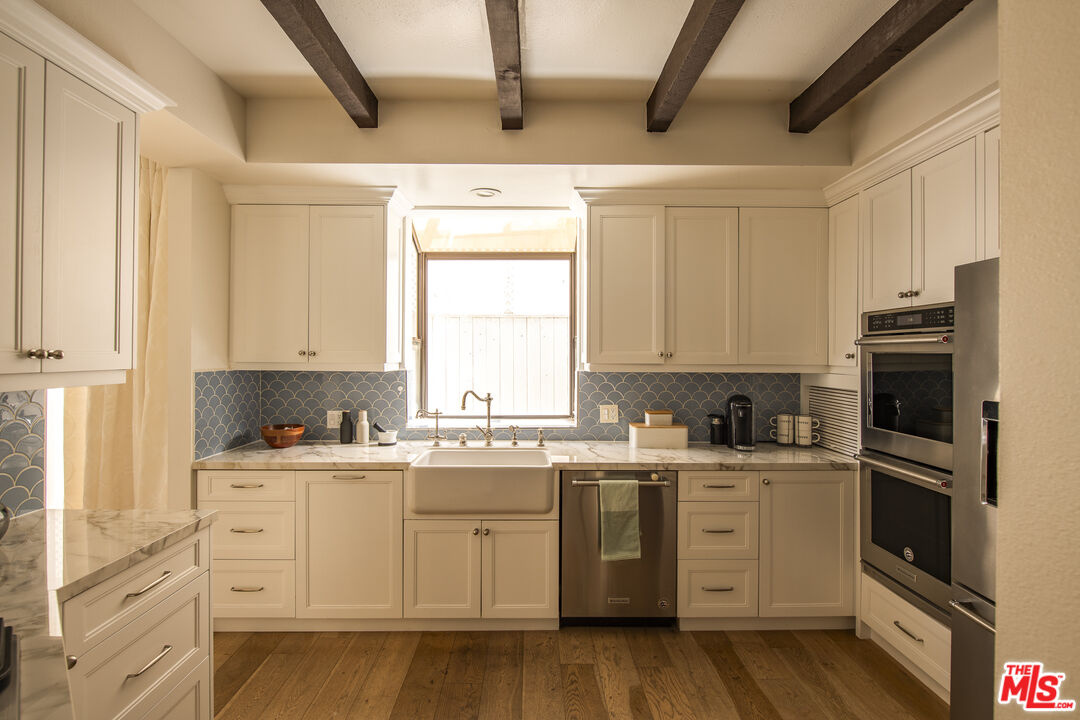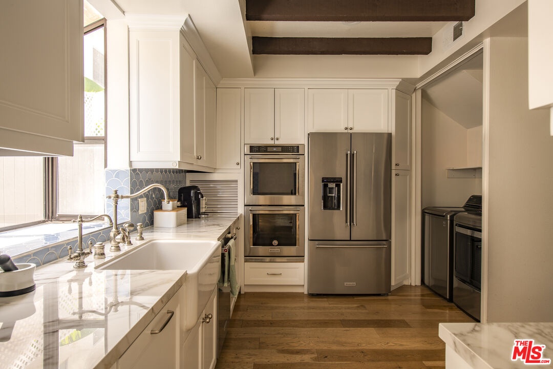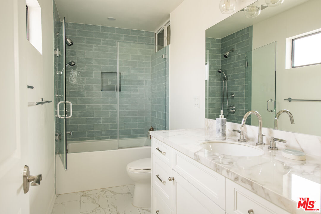 Front-facing and thoughtfully updated, this townhouse-style residence offers the feel of a private home in an intimate Santa Monica setting. This light-filled 2-bedroom, 2.5-bath home features soaring ceilings, expansive windows, and an open, airy layout throughout. The living room is anchored by a fireplace and opens to a lush, greenery-lined patio, while the adjacent dining area flows seamlessly to a second outdoor space, perfect for indoor-outdoor living. The remodeled kitchen is tastefully appointed and includes a convenient in-unit laundry area. Upstairs, the spacious primary suite showcases high ceilings, abundant natural light, and a beautifully updated bathroom with dual sinks, spa tub, and generous closet space. A well-sized secondary bedroom offers excellent light and storage. A versatile loft provides the ideal space for a home office or gym and leads to a large private rooftop terrace with lovely city views. Additional features include hardwood floors, a fireplace, two parking spots in the garage, an EV charger for unit 1 exclusive use, and a storage unit in the garage. Located just moments from the ocean, dining, shopping, and all the best of the Westside, this is an exceptional lease opportunity in a prime Santa Monica location.