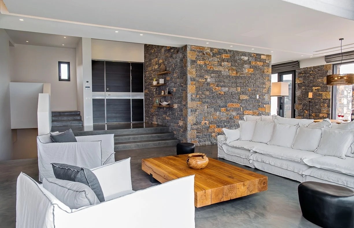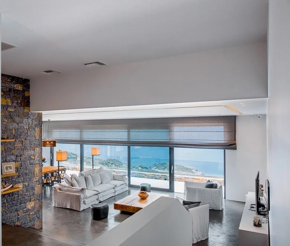 The villa can accommodate up to 10 people. Four en-suite bedrooms with panoramic sea views, in addition, there is a spacious open plan living room with a fully equipped modern kitchen and dining area surrounded by large glass windows offering incredible views. A small internal staircase leads to the second floor where the master bedroom is located. On the lower level is a second living room used as a game room with a home theater system.The spacious living room on the ground floor is surrounded by balcony doors that open onto sun terraces with a 90 sqm infinity swimming pool. and a covered dining area by the gazebo.