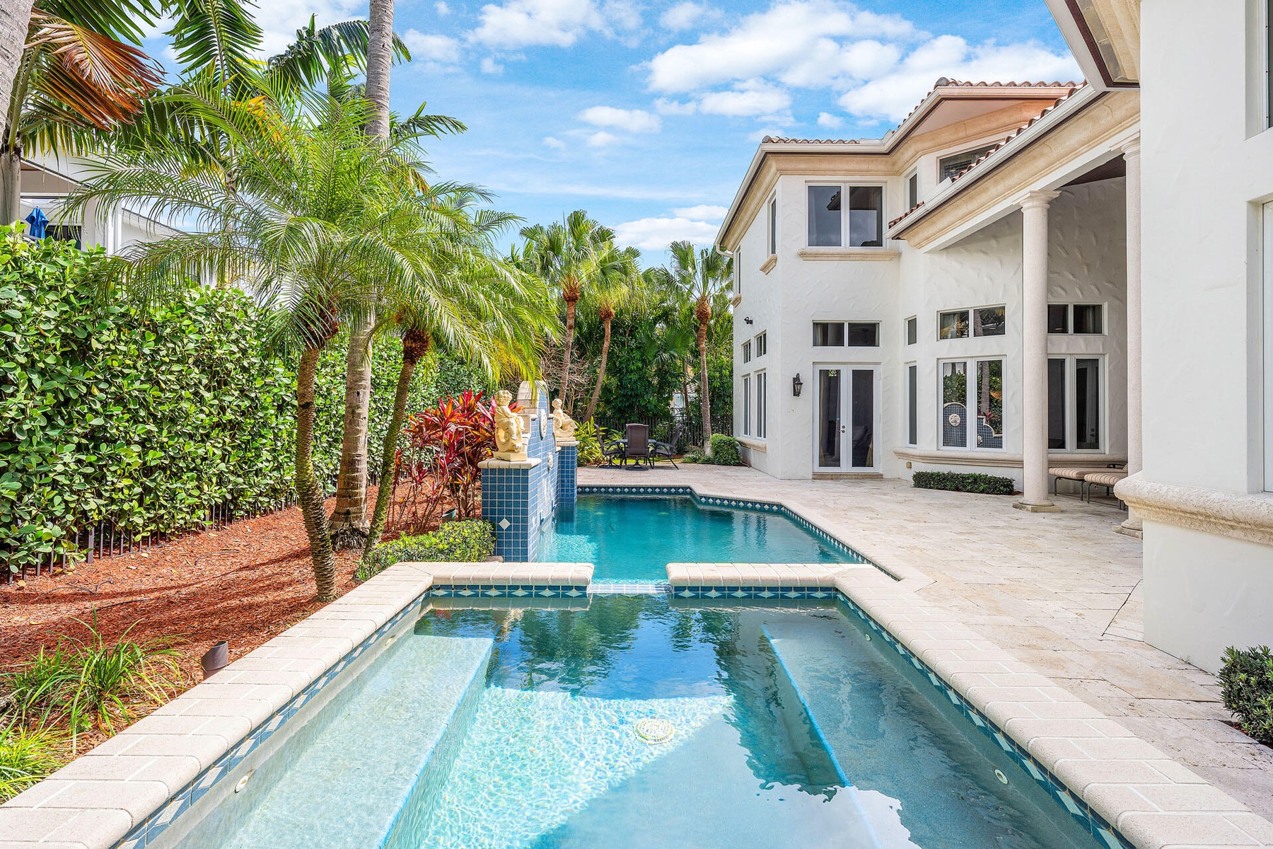 2386 W Maya Palm Drive is an elegant traditional estate on a quiet interior street in Royal Palm Yacht & Country Club, offering timeless architecture and a warm, inviting atmosphere. This 5-bedroom home features approximately 5,000 SF of refined living space, with marble flooring on the main level and bright east exposure that fills the interiors with natural light. The first floor includes a luxurious primary suite with his and her baths, a private office, and generous formal and casual living areas that function well for both everyday living and entertaining. French doors open to the pool and patio, promoting an easy indoor-outdoor flow and views of the landscaped grounds. Outside, the backyard provides ample space for lounging, dining, and poolside enjoyment, framed by mature tropical landscaping for privacy. The home combines classic Royal Palm style with comfortable South Florida living.