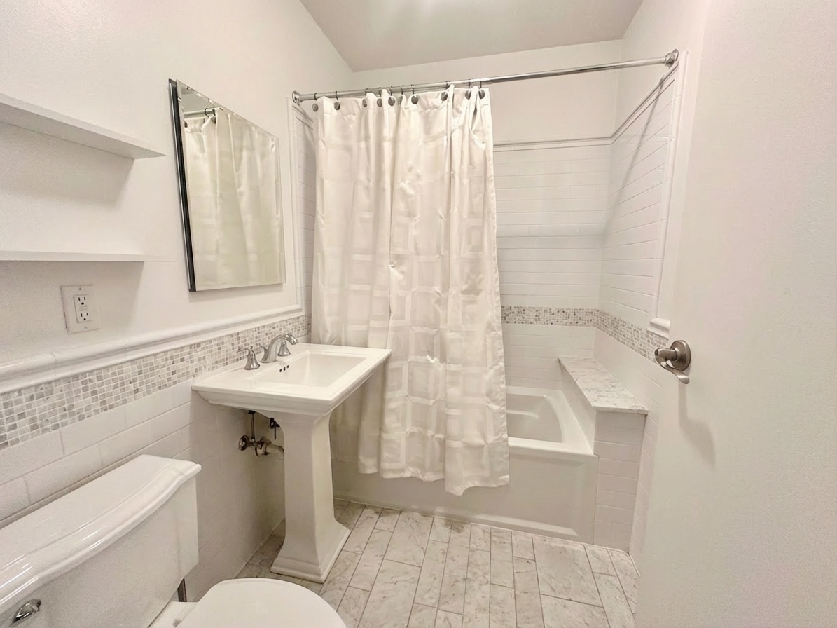 The bathroom is clean and modern, featuring a full tub, tiled walls, and updated fixtures.
