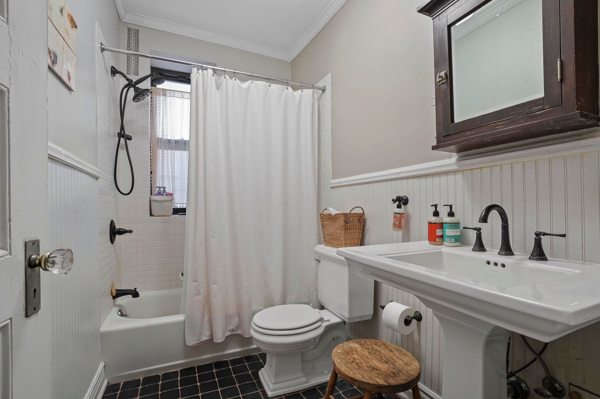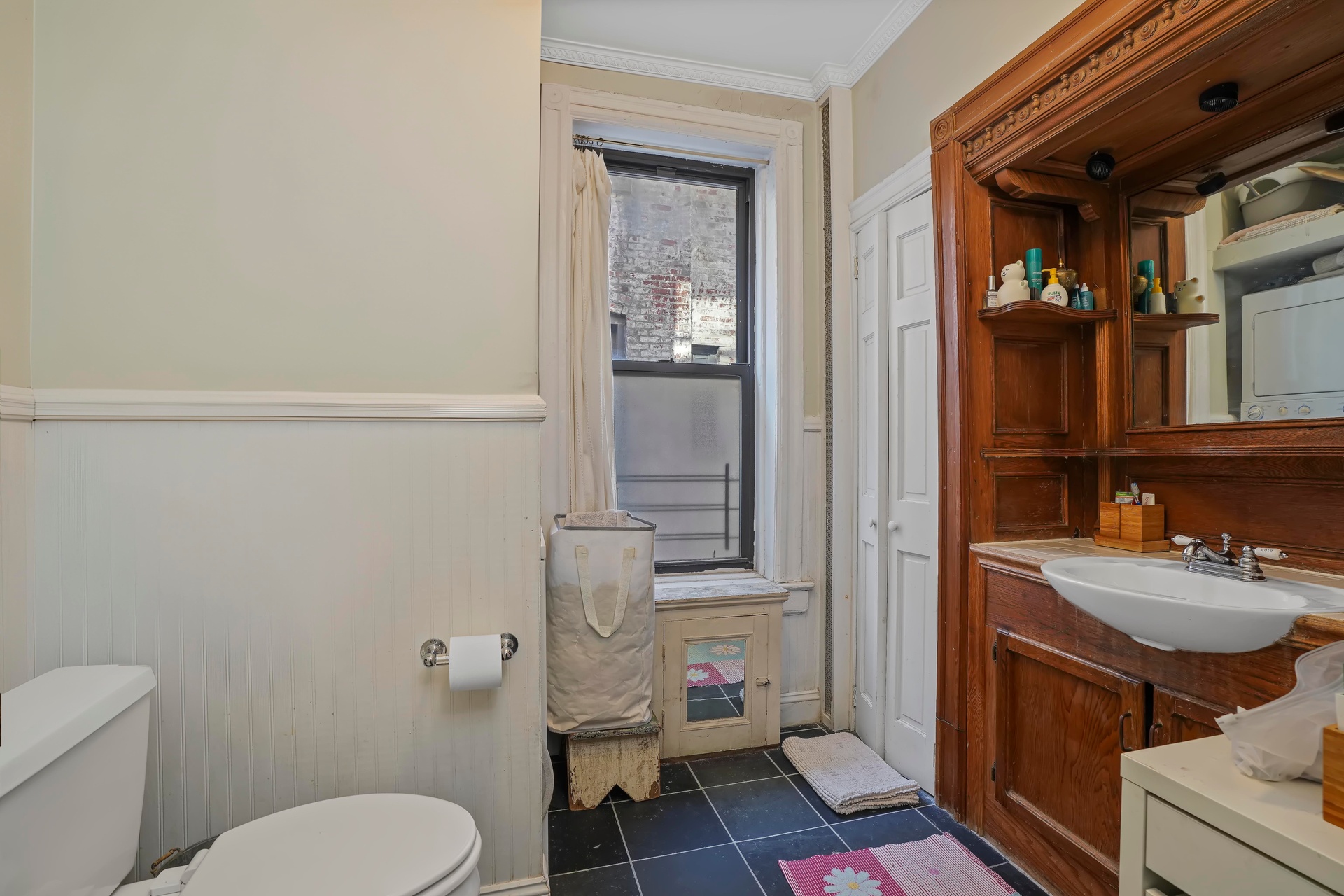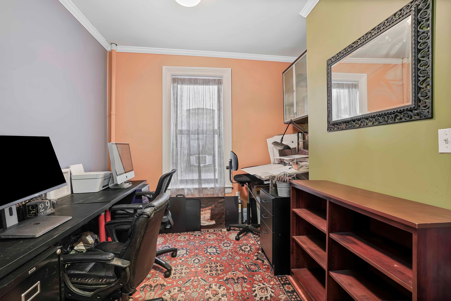 Bathed in natural light from eastern and western exposures, the home unfolds along a long central hallway that creates privacy and flow between living and sleeping spaces. The inviting living room captures the timeless charm of Park Slope’s historic architecture, while 10-foot ceilings enhance the sense of openness throughout.