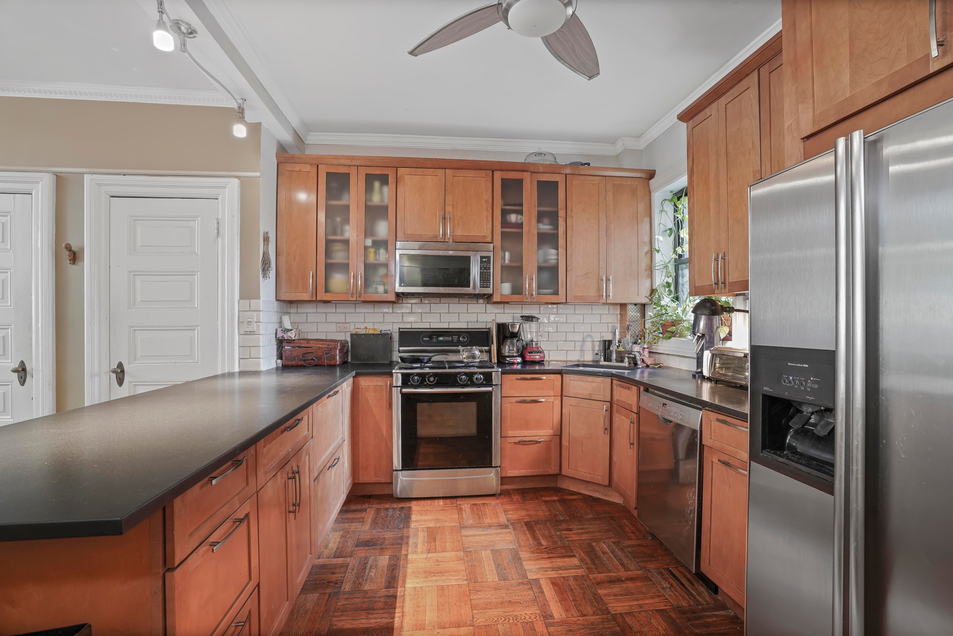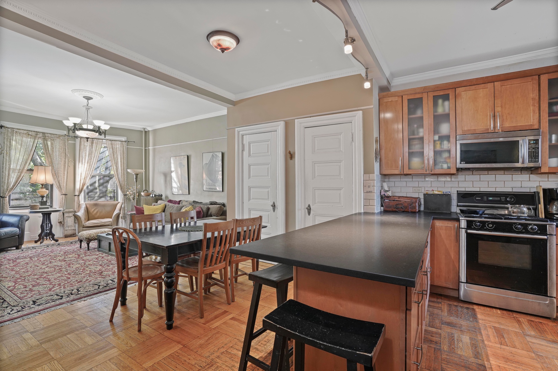 Just one block from Prospect Park, this gracious floor-through residence offers classic brownstone character paired with thoughtful modern updates in an intimate, eight-unit co-op.
