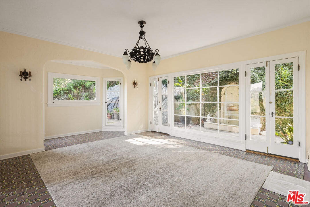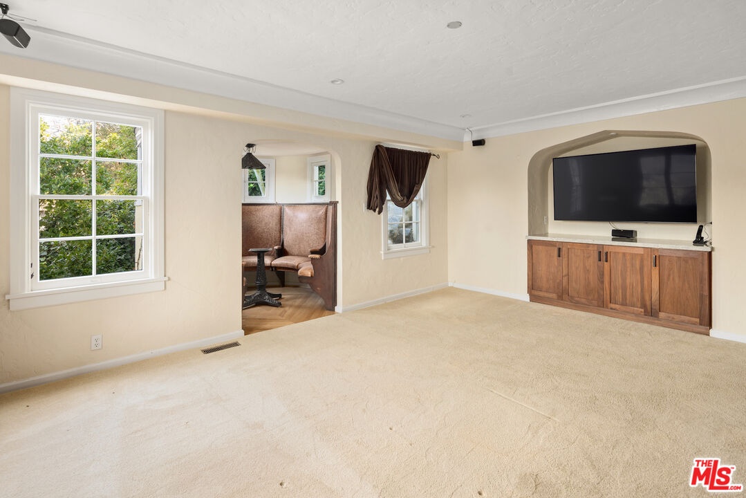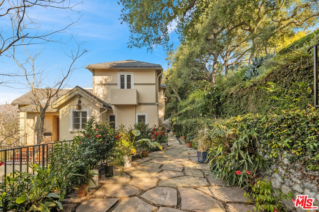 Wonderful opportunity to live in one of the original Uplifters Ranch houses built in 1927. Coddled amongst mature California Oaks, this three level, spacious half-timbered stucco house is placed near the top of the Rustic Canyon rim embracing canyon views from most rooms. When entering the front door one experiences the most impressive ballroom like living room, ordained with a hotel scale fireplace, hardwood and floor to ceiling windows making the ascent worthwhile. The main level also includes the formal dining room, a modern kitchen and office leading all embracing the outdoor gardens. The upper level has three bedrooms and two baths all facing canyon views, including a comfortable main bedroom suite. The lower level with the original unique basement bar and circular card room is part of a family room and is attached to two bedrooms and a bath, potentially can be used as a separate apartment with its own entrance. A two car garage is located at the street level. The house is in the heart of Rustic Canyon adjacent to the Rustic Canyon Park.