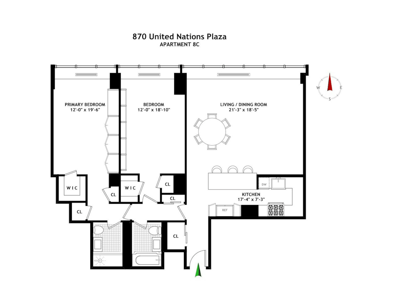 This elegant, spacious, light, recently renovated, mint, two bedroom, two bath apartment with captivating, open city and river views from oversized floor to ceilings windows is located in the coveted, iconic UN Plaza. Enter the large foyer which leads into a gracious open living/dining room ideal for entertaining. Large primary bedroom features an en-suite bath and a wall of custom closets plus additional closets including a walk-in. The oversized second bedroom with custom shelving is also suitable as a library or guest room. Renovated, open chef's kitchen with stainless steel appliances, quartz countertops, generous storage and large dining island. There are abundant large closets including two walk-ins, hardwood floors, central A/C and heat plus private storage is included with the sale making this a special home that is priced to sell.