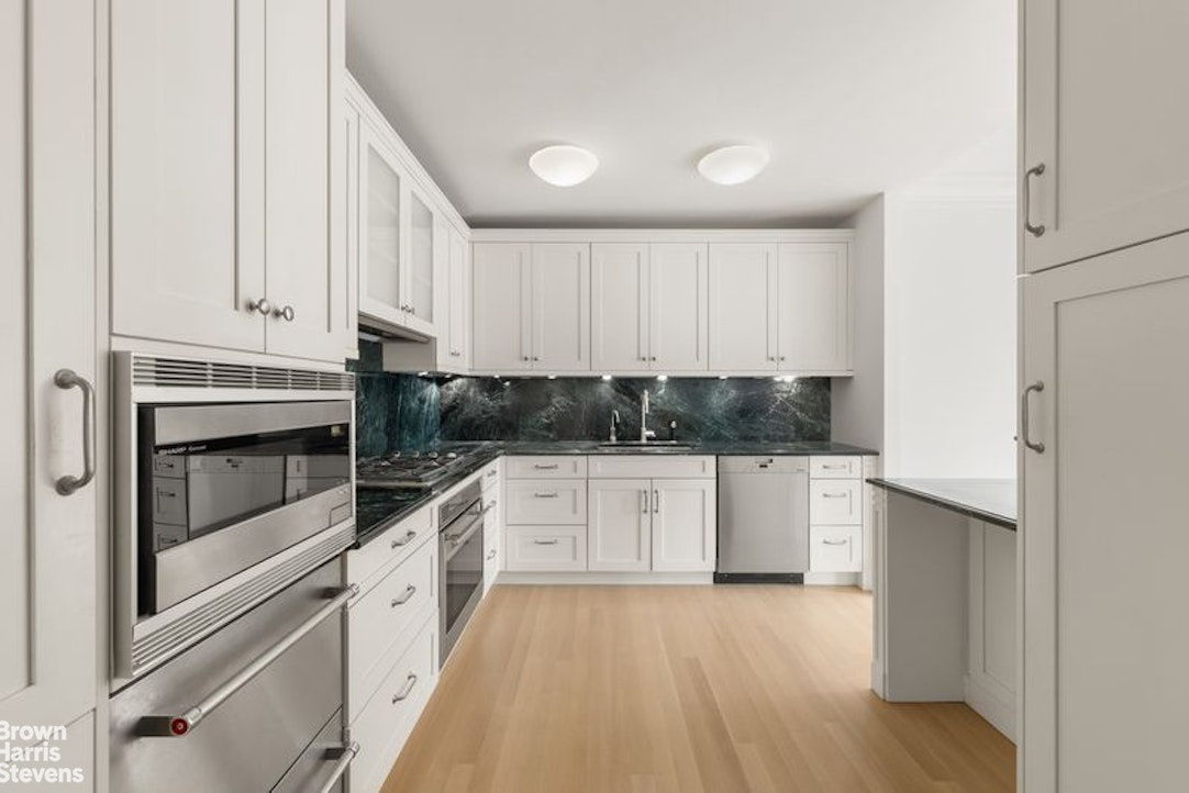 The chef's eat-in kitchen is thoughtfully designed and outfitted with top-of-the-line appliances, including a Sub-Zero refrigerator with additional refrigerator drawers, a Wolf gas range and oven, and a Miele dishwasher. A brand-new full-size washer and dryer have been added. Adjacent to the entrance gallery is a powder room.