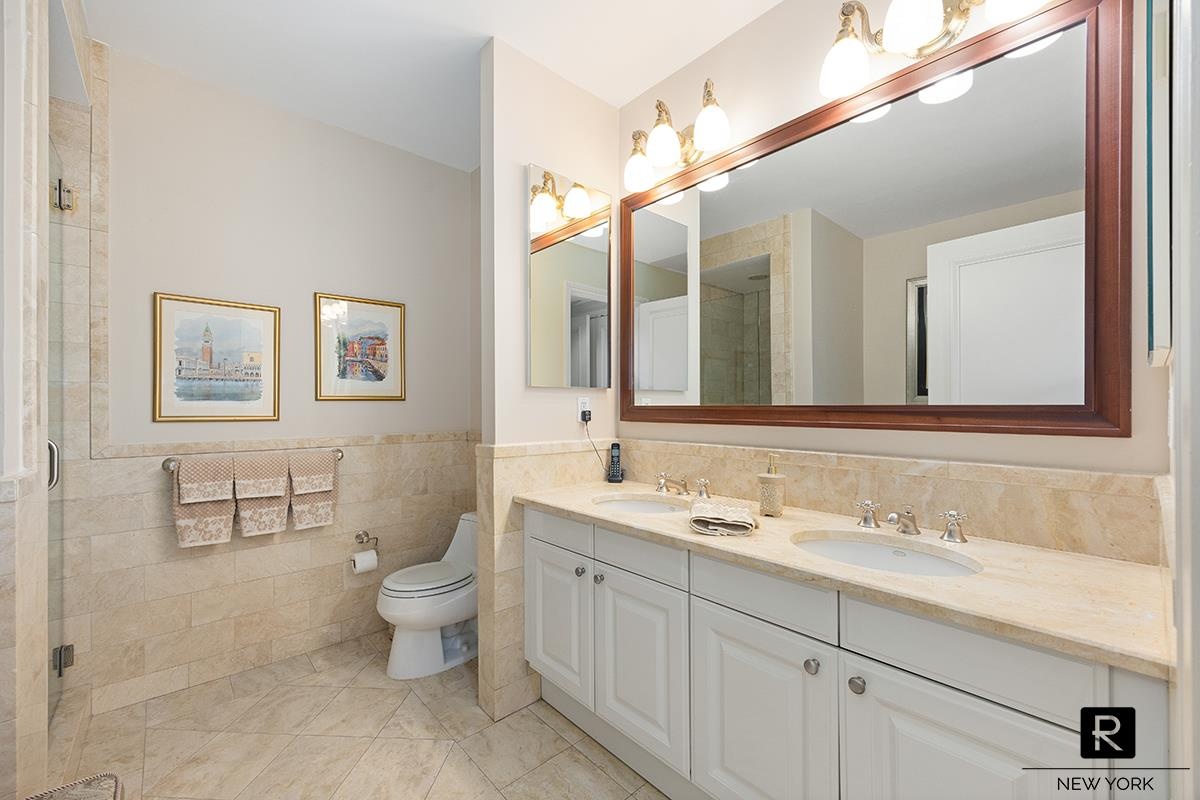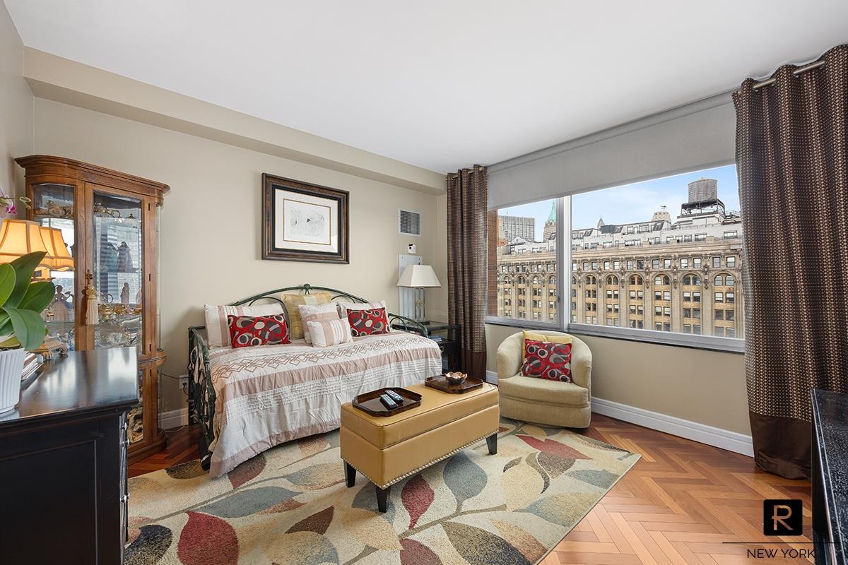 This high floor residence offers lots of natural light, large windows and views of the Hudson River, One World Trade Center, Empire State Building and New York Harbor. The interior features classic herringbone hardwood floors throughout, an entry gallery, and an expansive living area with 270-degree views. The kitchen is equipped with high-end appliances from Subzero, Viking and Bosch—paired with granite countertops and a breakfast bar pass-through.