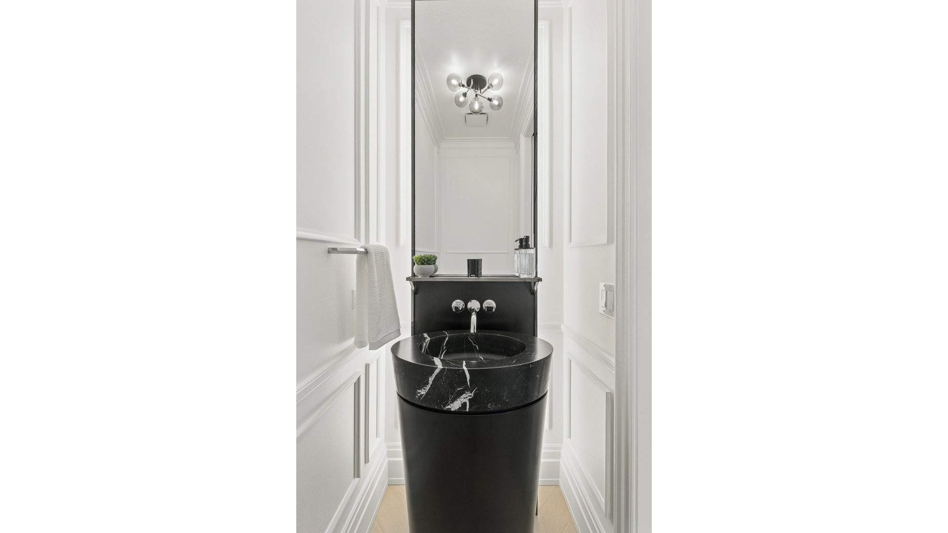 Additional highlights include a striking powder room with sculptural Nero Marquina marble sink, a black metal mirror with integrated lighting, and a utility closet with in-unit washer and dryer.