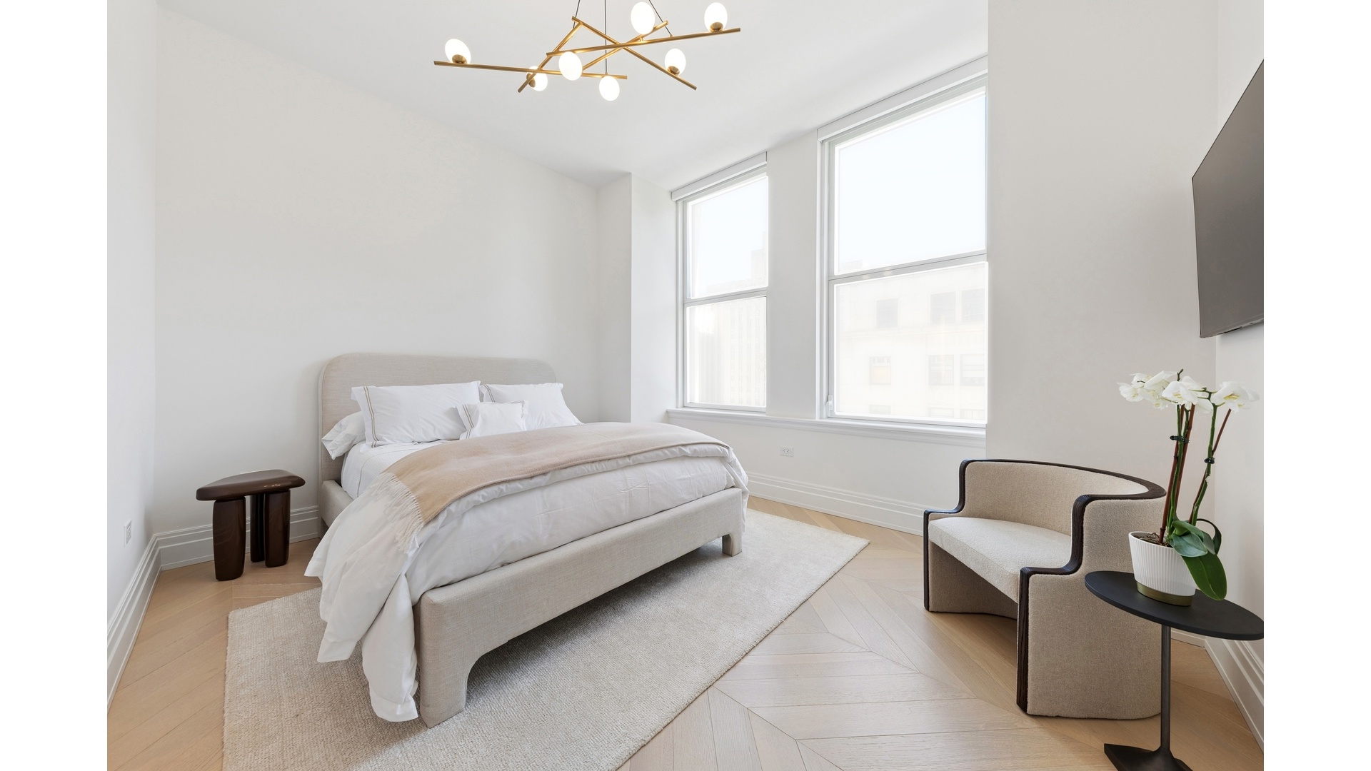 The serene primary suite features expansive windows and a spa-inspired en-suite bath clad in high-honed Calacatta Mandria marble. Fantini polished chrome fixtures complement a custom double vanity and an oversized walk-in shower, creating a refined and tranquil retreat.