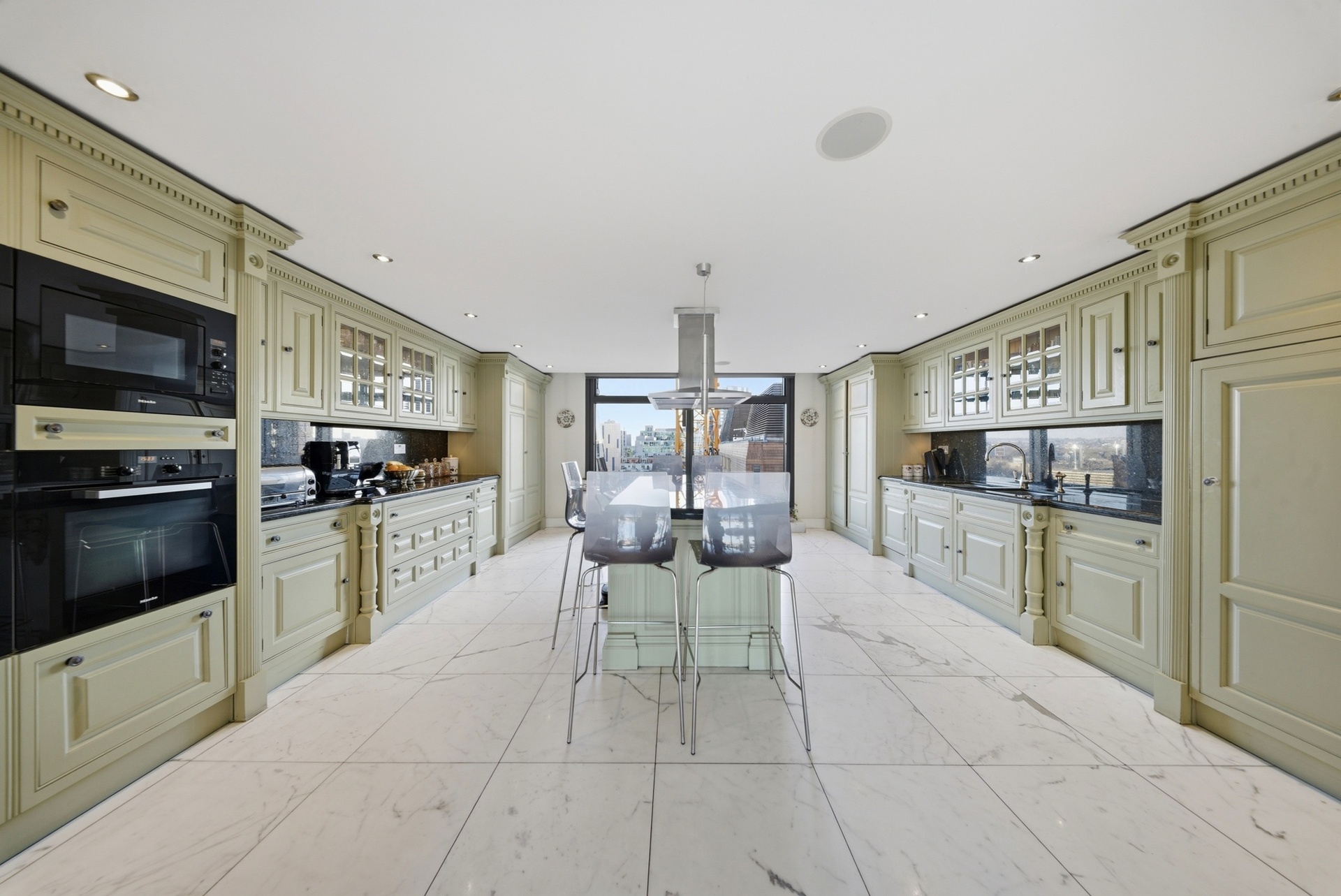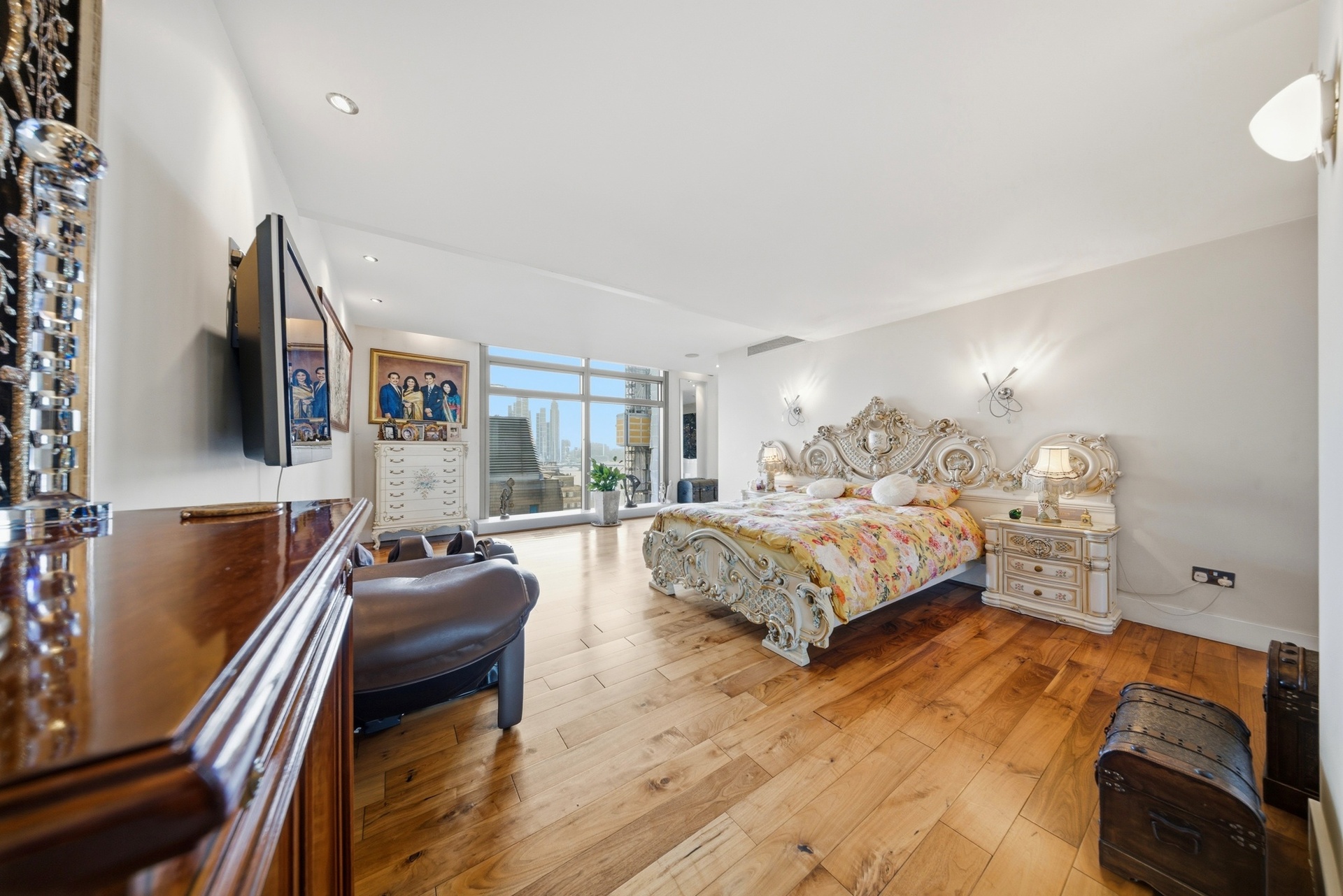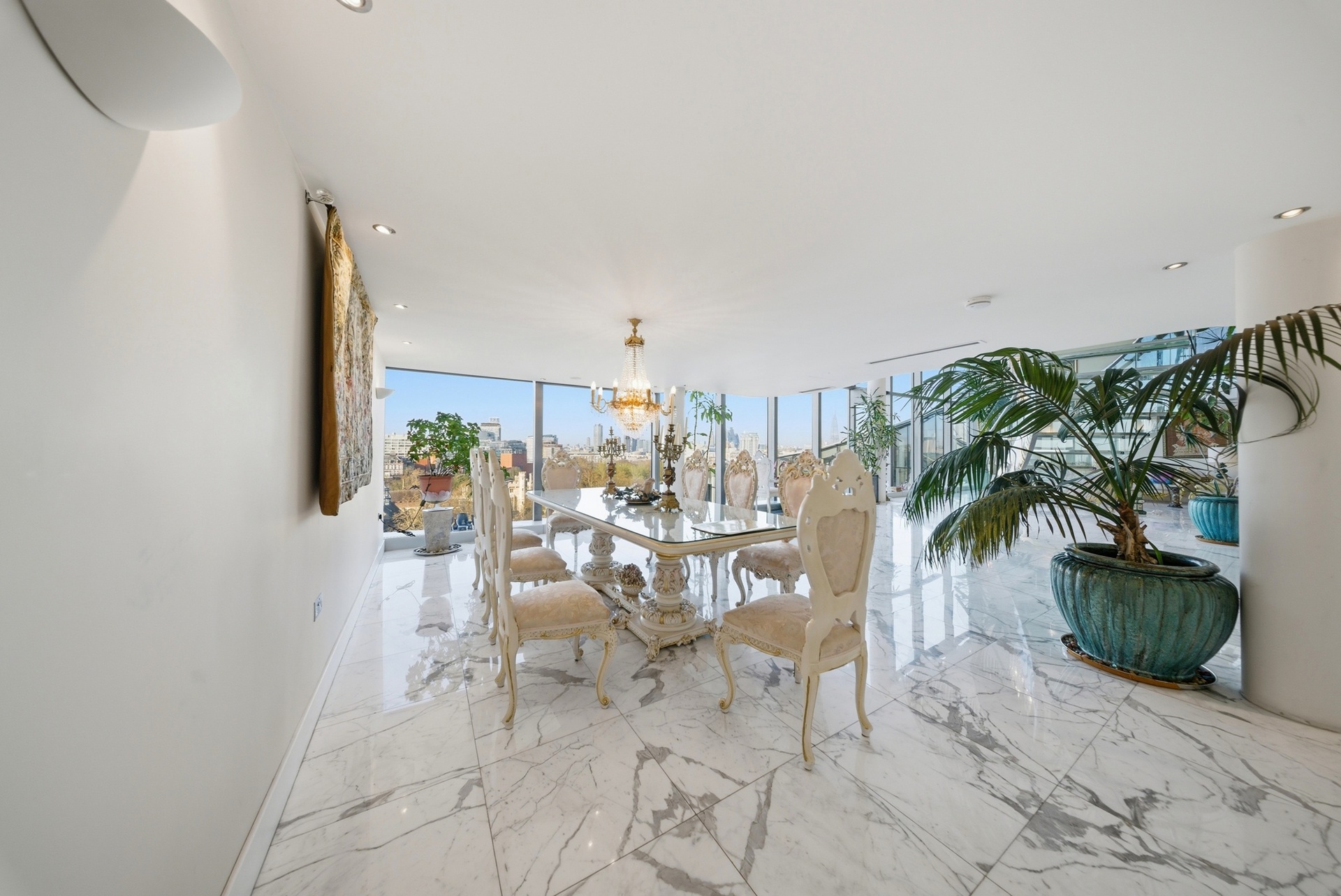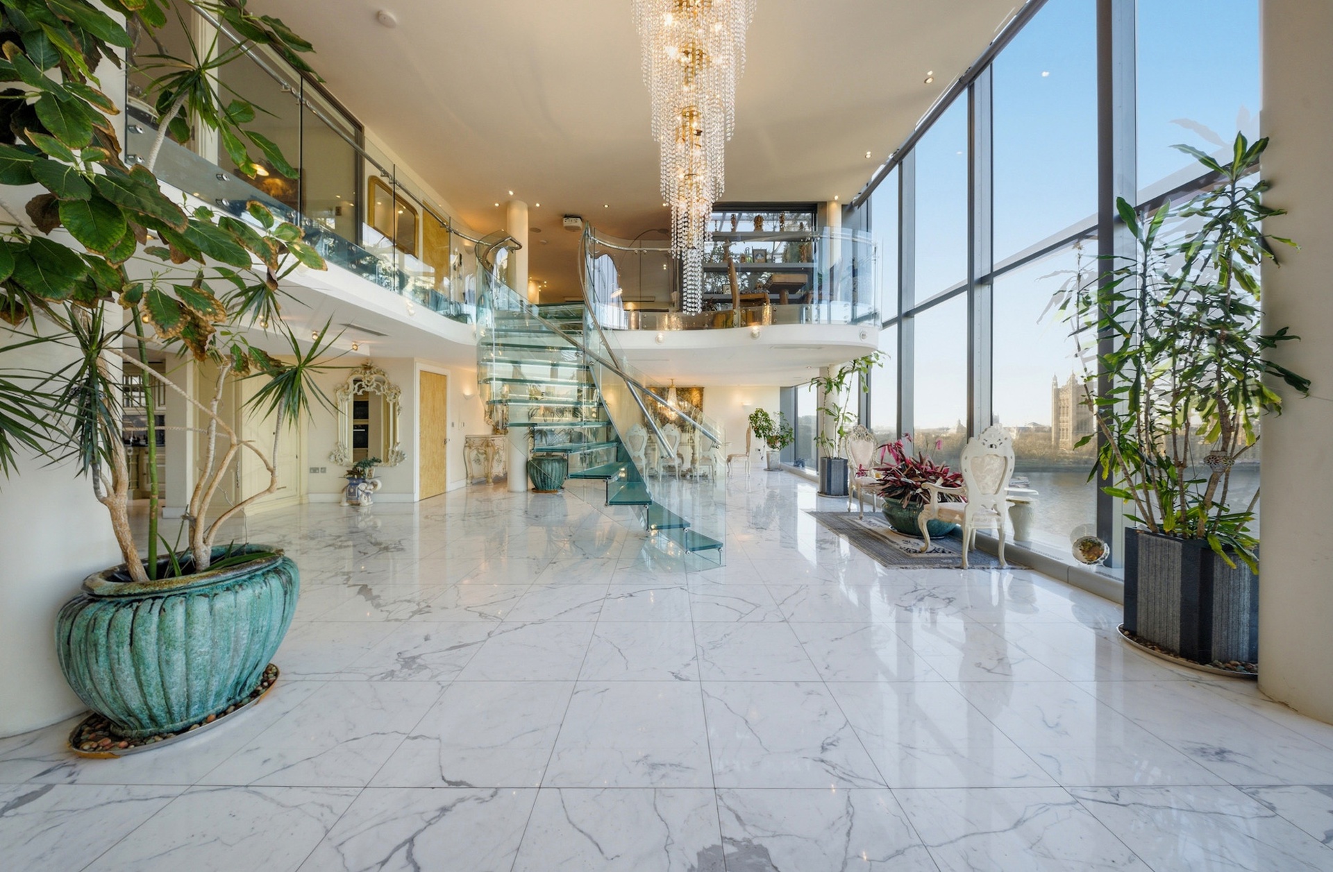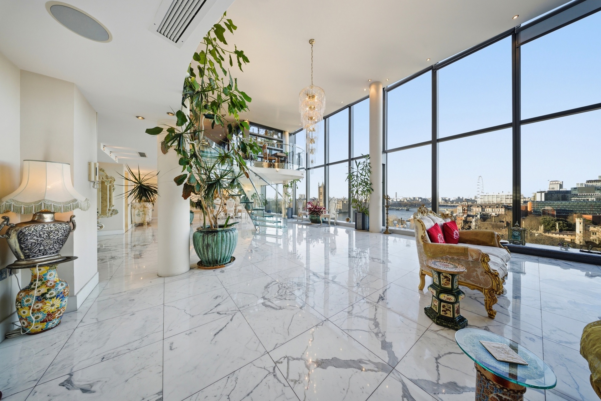 Extending to over 4,000 sq ft, the apartment has been designed to maximise light, volume and uninterrupted riverfront views. The principal reception space is vast and dramatic, framed by approximately six-metre floor-to-ceiling glazing that captures a sweeping panorama across the Thames towards the Houses of Parliament, Big Ben and the London Eye, a setting that truly feels like living within a postcard of London.