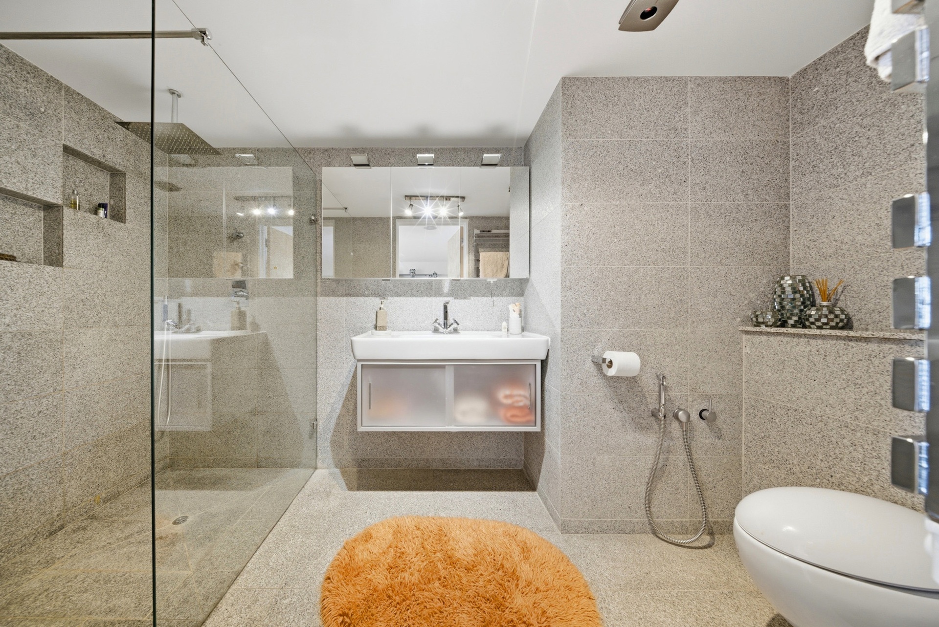 The accommodation comprises three substantial bedroom suites, each offering generous proportions and privacy, alongside a dedicated study ideal for remote working or private office use. The principal suite is particularly impressive, complemented by extensive storage and a refined en-suite bathroom.