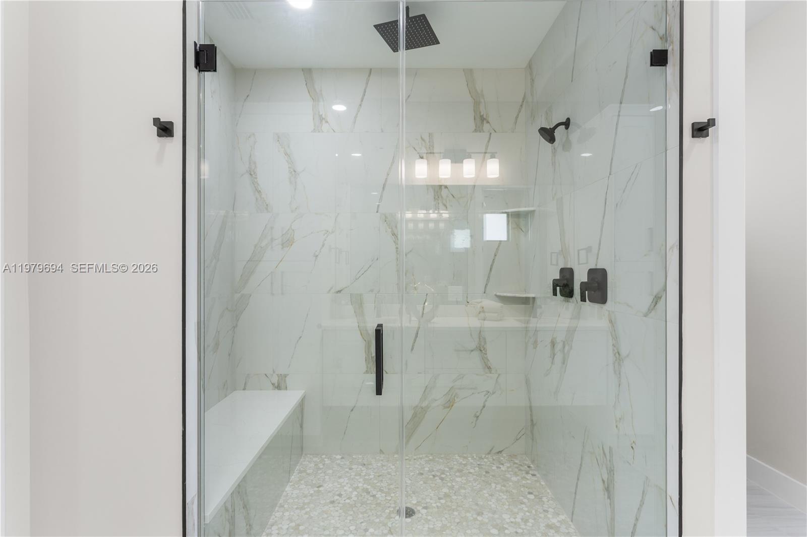 - LUXURIOUS PRIMARY BATHROOM w/ spacious WALK-IN GLASS SHOWER w/ floor-to-ceiling designer tile, rainfall showerhead, built-in bench & modern matte-blac