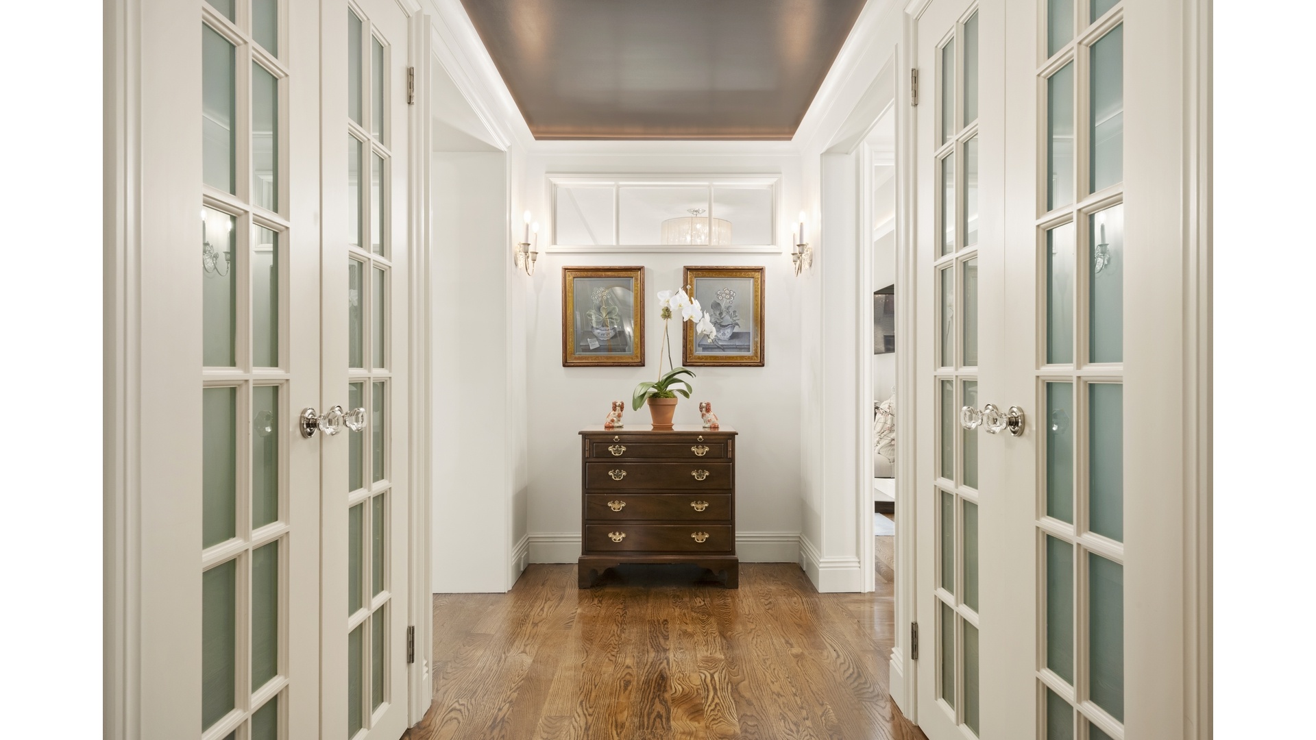 The apartment has been reimagined with a steady and disciplined hand. A gracious foyer, lined with custom closets, opens into a dining area and then to a broad living room where the park unfurls beyond. The proportions are generous, the lines clean. Solid hardwood floors have been soundproofed underfoot. Millwork is precise and quietly confident. Recessed lighting and electronically controlled sunshades respond to mood and moment, allowing the architecture and the view to remain the true focal points.