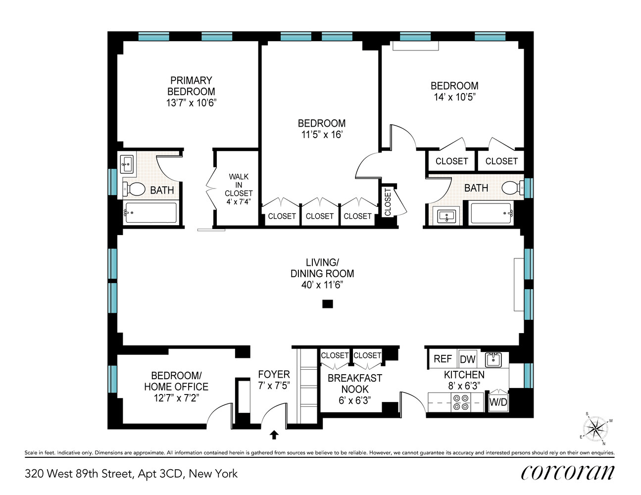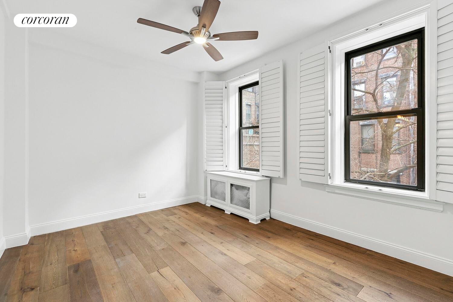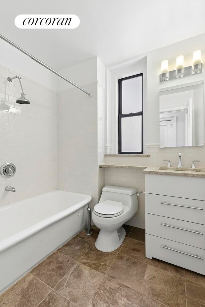Tastefully renovated. Broad proportions. An abundant space to call home! Step inside this spacious 3 bedroom 2 bath, and you're greeted with a welcoming, high-utility entry foyer/mud room. Park the stroller, the shopping cart, the bike; it all lands here. The 40 foot wide living/dining room has dual east & west exposures for superb natural sunlight and finished with beautiful, hard-wearing smoked oak floors. Separate from the living space, the windowed kitchen with its breakfast nook is the perfect place to start the day. Outfitted with absolute black granite countertops, piano lacquer cabinetry, glass backsplash, and full complement of stainless steel appliances. The south wing of the home features three extra-large bedrooms, the primary with ensuite bath and custom built walk in closet. The 2nd and 3rd bedroom have ample space for queen size beds and additional furniture, plus a full wall of closets and built-ins. The 2nd bath has been refreshed with basket-weave marble tile, pedestal sink, designer fixtures and linen closet. Just inches away from being classified as a legal 4th bedroom, the home office offers more high-utility attributes with a separate entrance and additional plumbing riser, to create a 3rd bathroom if needed. Attention to detail on this quality finish with recessed overhead lighting, in unit Bosch washer/dryer, and solid wood shutters for each of the 13 windows.