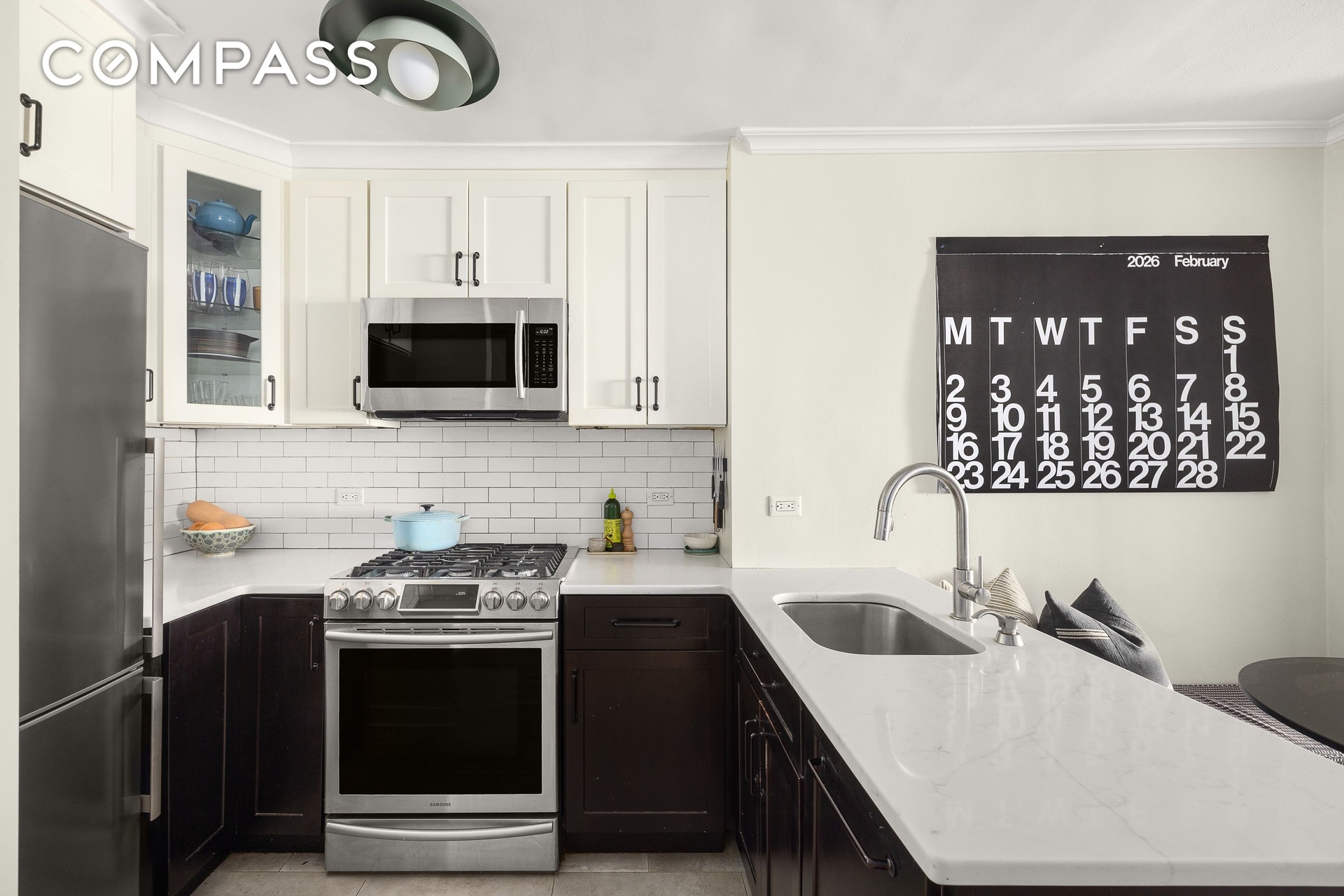 This beautifully renovated co-op features a modern, open chef’s kitchen with stainless steel appliances including a full-size Samsung gas range and a Blomberg Dishwasher.