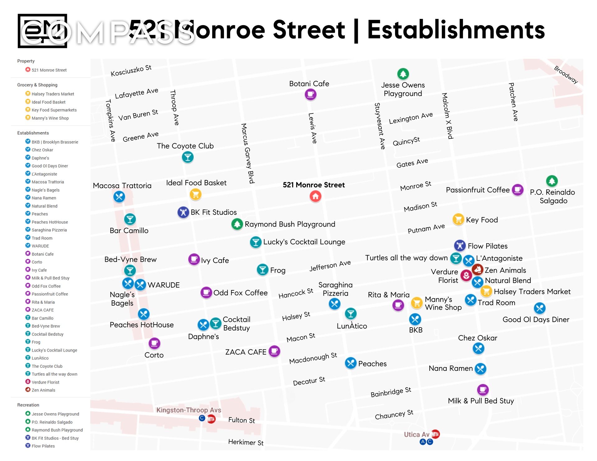 Nestled on a picturesque, tree-lined street, 521 Monroe enjoys proximity to beloved restaurants like Trad Room, Laziza, Saraghina, and Chez Oskar. Nearby parks offer courts and playgrounds, while the A/C trains, B26 bus, and a 20-minute drive to JFK ensure effortless connectivity.