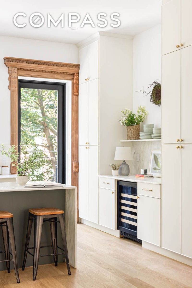 The living space flows seamlessly into a show-stopping chef’s kitchen, thoughtfully designed for both entertaining and everyday use. Featuring custom cabinetry, high-end integrated appliances—including a French-door Bosche refrigerator, six-burner Wolf range, microwave, wine cooler—and a marble-clad center island, the kitchen balances beauty with utility.