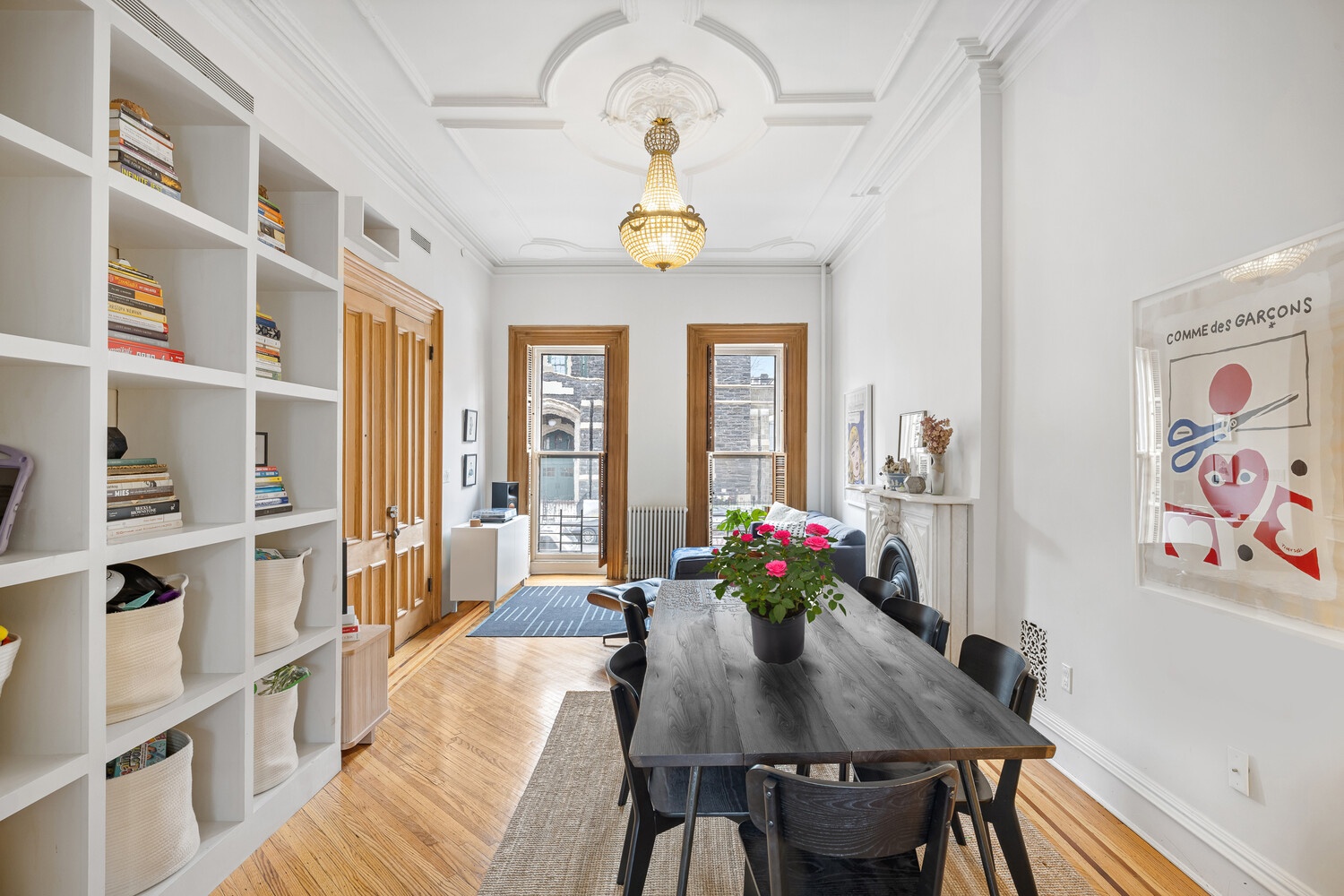 A stately redbrick facade, a deep front yard, and an arched entry door set the tone for the exquisite interiors within. Natural light spills through tall sash windows, accentuating beautiful hardwood floors with border inlays as well as old-world details like intricate ceiling medallions, French and pocket doors, regal crown molding, and decorative marble fireplaces. Soaring ceilings add a sense of grandeur, and a refined design aesthetic creates spaces that are modern, warm, and inviting.