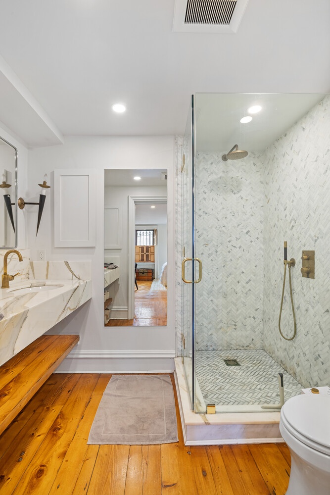 The sprawling garden duplex offers 3 spacious bedrooms and 2.5 luxurious bathrooms. On the upper level, a spacious living and dining room flows seamlessly into a windowed kitchen-perfect for grand entertaining, intimate gatherings, or tranquil mornings. The kitchen is a chef's delight, featuring a luxury stainless steel appliance package, marble countertops, custom shelves and drawers, and a stylish eat-in island. A chic powder room is easily accessible. All three bedrooms are on the lower level, which has the added convenience of a second entry point. The king-size primary suite includes abundant closet space and a spa en-suite with a marble double vanity and a walk-in rainfall shower. The second and third bedrooms share access to a pristine second bathroom with a clawfoot tub and rainfall shower head. Additional highlights include a large convertible cellar, a dedicated laundry area with a utility sink, and an expansive backyard.