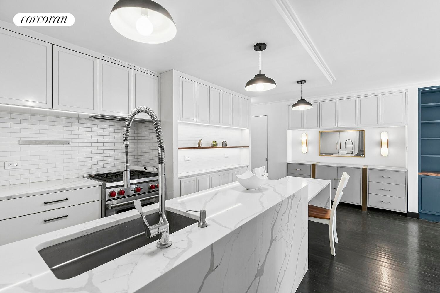 The open kitchen is a chef's dream, featuring bespoke finishes and high-end appliances, including a Wolf range, concealed refrigerator, wine cooler, and dishwasher. The Caesarstone countertops and stylish table offer ample space for entertaining or additional cooking. An abundance of cabinetry and counter space, complemented by a stunning tile backsplash, completes this culinary haven.