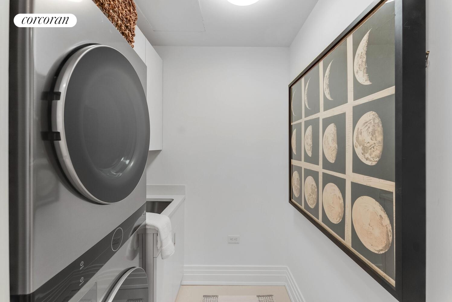 A striking powder room features Panzer honed marble throughout, while a spacious laundry room includes a sink and LG washer and dryer.