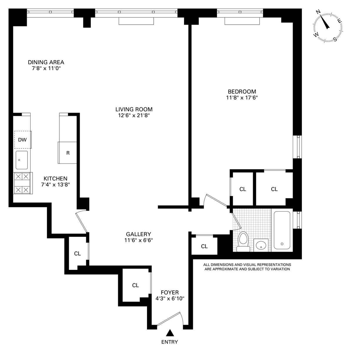 The versatile entry hall with its own walk-in closet leads directly into a large open plan living area. The kitchen is generous and separate from the living room, but there is potential to knock through to create one huge open-plan space to suit your lifestyle. The dining alcove is an incredibly versatile space that can function as a dining area, home office, artist space or guest room. Many of the other residents with this similar layout have fully converted the space into a second bedroom, which further emphasizes the potential.