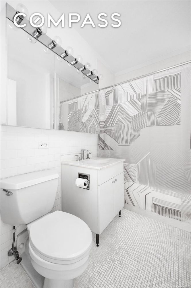 The chef’s pass-through kitchen is outfitted with top-of-the-line stainless steel appliances, including a dishwasher and microwave, high-gloss white cabinetry, and elegant slate-gray granite countertops. The marble bathroom features sleek, modern finishes.