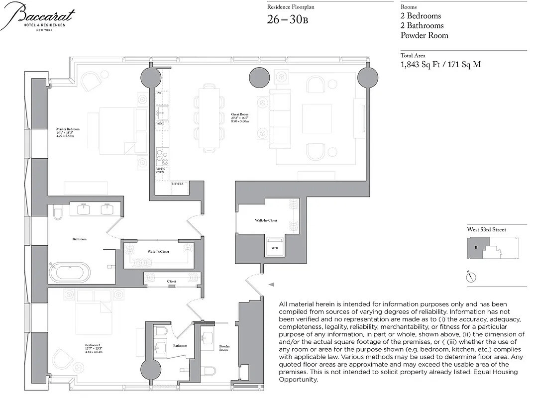 Spacious double-corner two-bedroom residence on a high floor at the Baccarat Hotel & Residences New York. Measuring 1,843 square feet (171 sq. m.), this home features an expansive living and dining area with floor-to-ceiling windows and 10'8" ceiling heights.