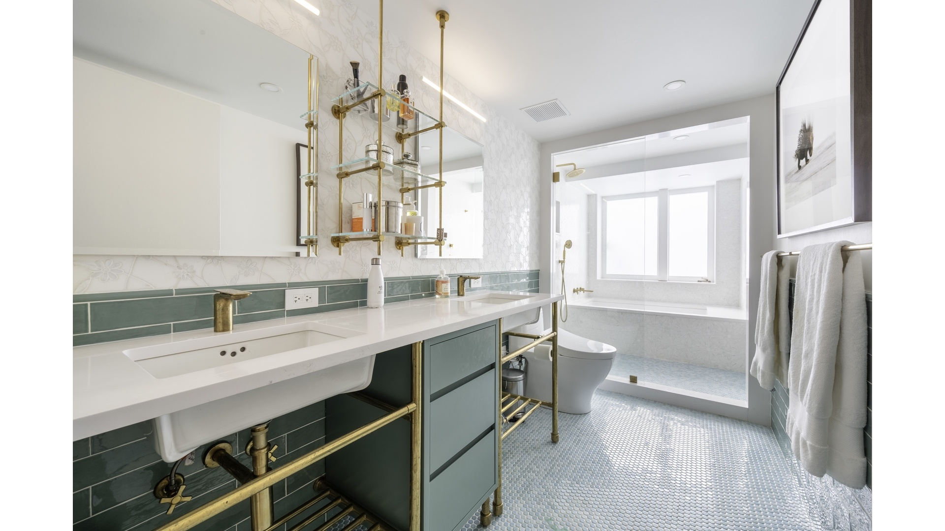 The full bath is a special space, lit by frosted windows admitting the South light. You'll enjoy the huge soaking tub, the separate shower area, toto toilet and cool tilework.