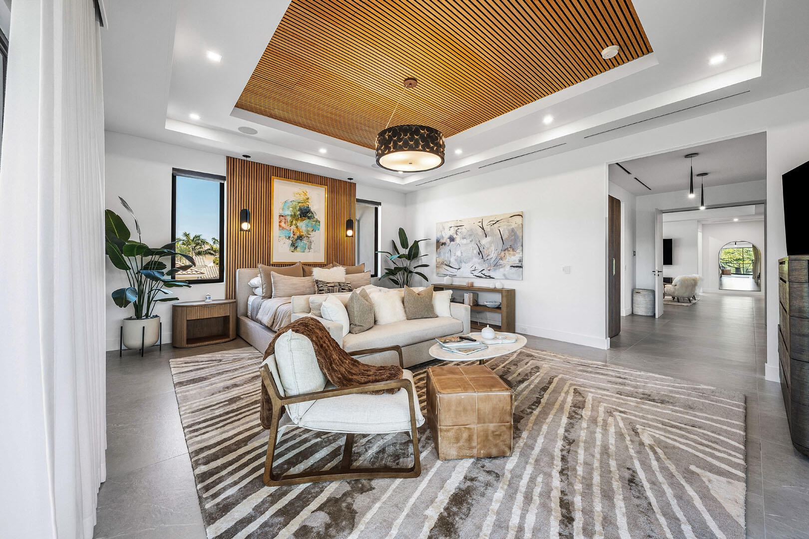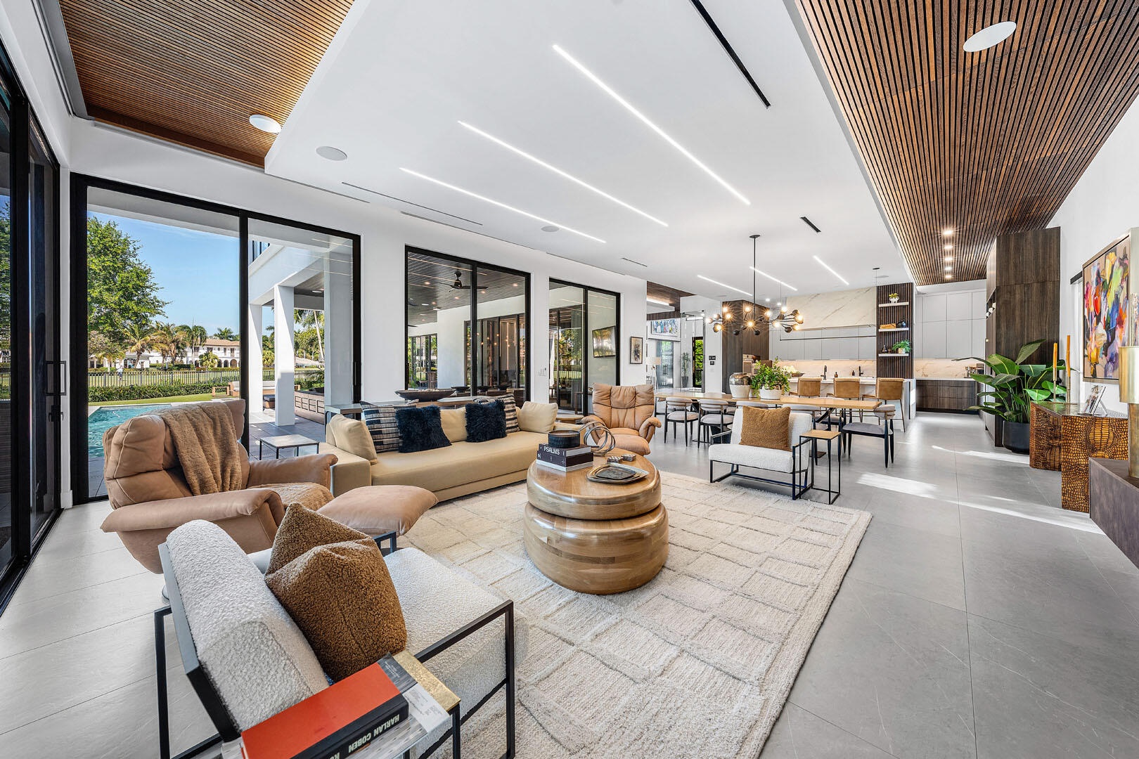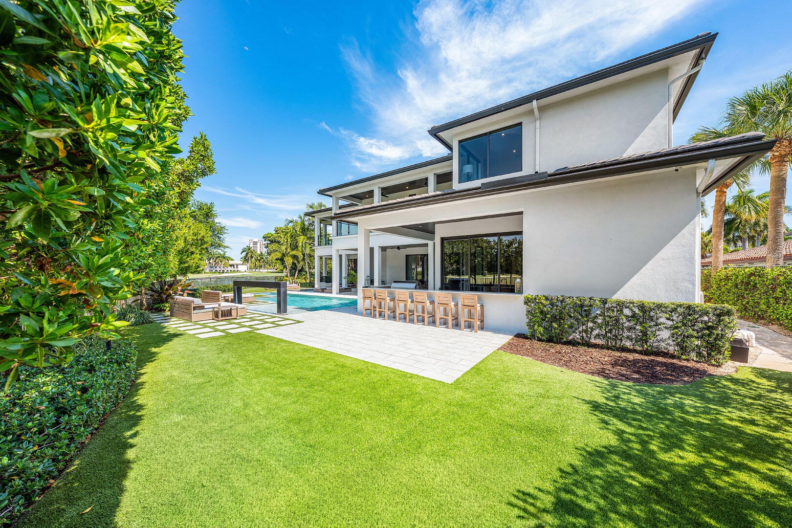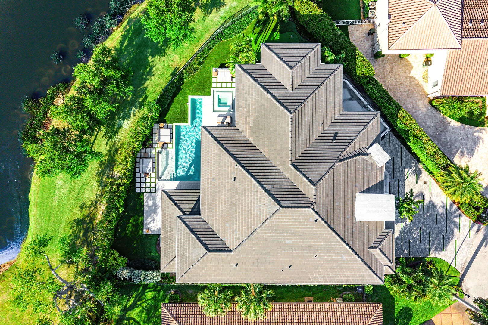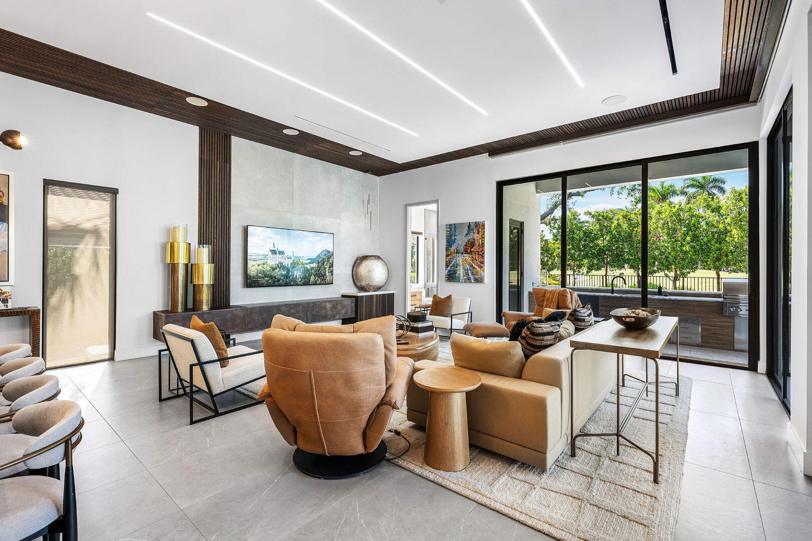 Welcome to 117 Thatch Palm Cove, located on the quietest cul-de-sac street in the prestigious Royal Palm Yacht & Country Club. Built in 2023 by Primo Construction, this golf course estate offers 165 feet of prime golf frontage with sweeping views of a serene pond and the Jack Nicklaus signature golf course, and features over 7,700 square feet of luxurious living space with 5 bedrooms, 6 baths, and a club room. Floor-to-ceiling glass brings in ample natural light and perfectly frames the tranquil water and golf views, creating a seamless connection between the chef's kitchen, family room, great room, and the resort-style outdoor area with heated pool, spa, covered seating, and lush landscaping. Additional highlights include a private putting green, full-house generator, and a three-car garage, one of which is an incredible show garage designed to showcase a prized automobile.