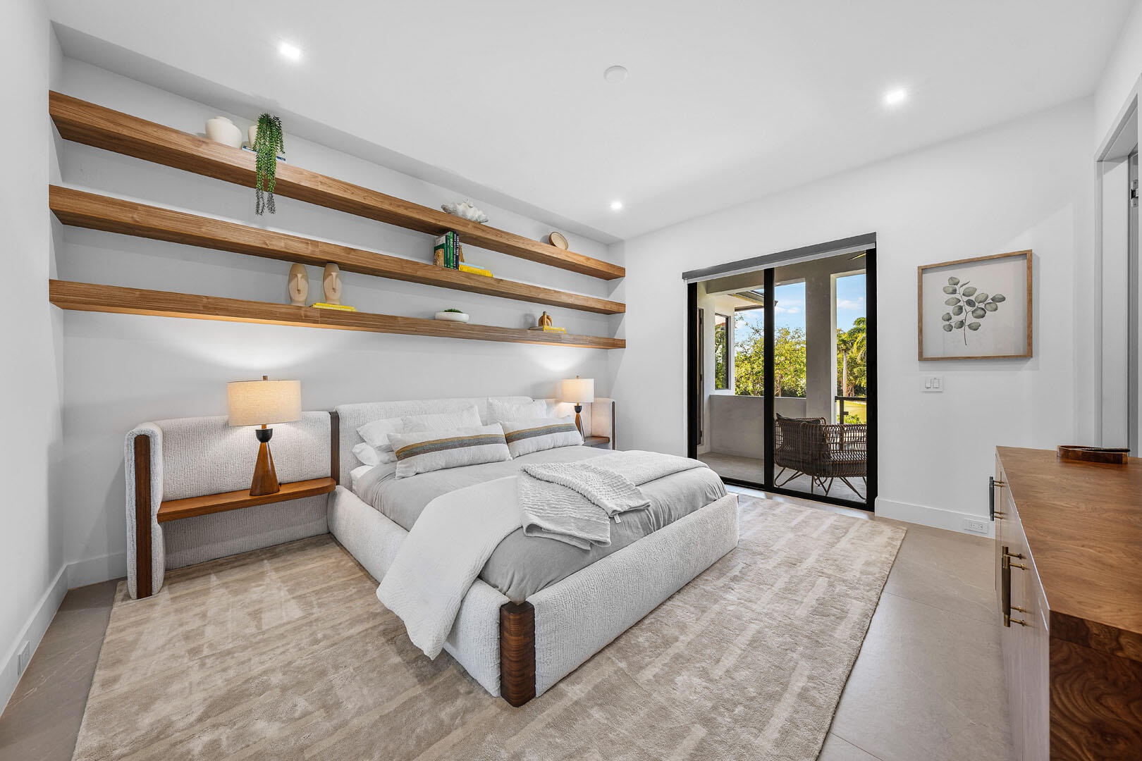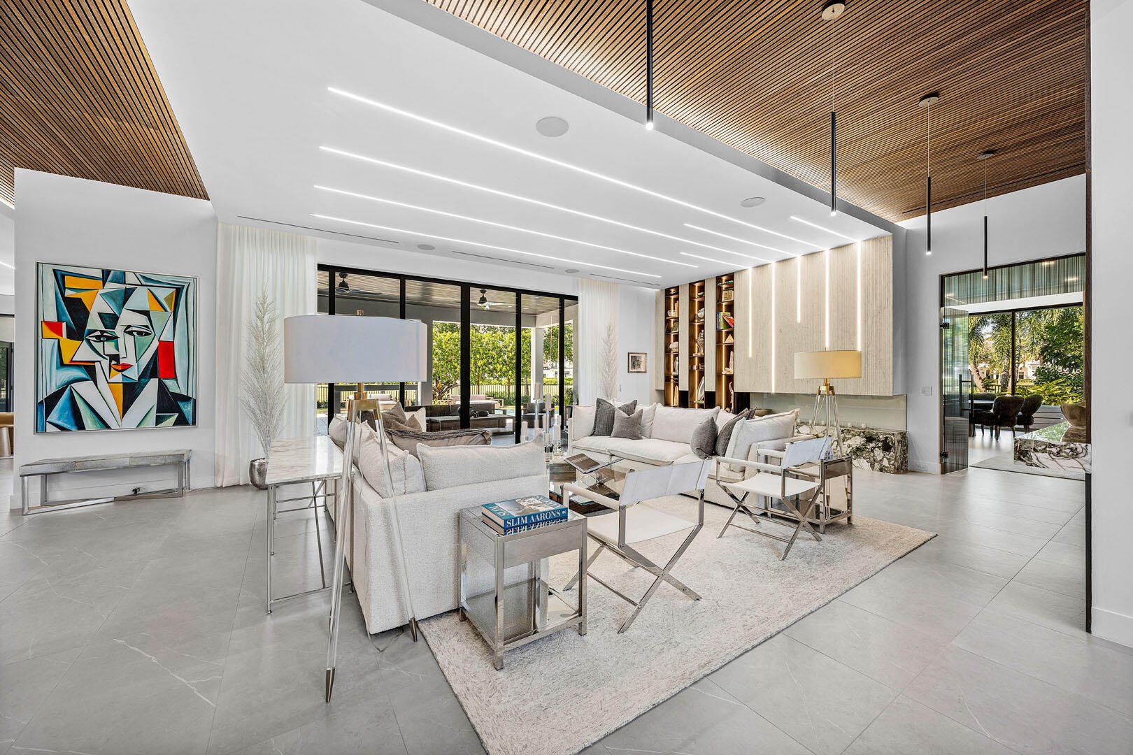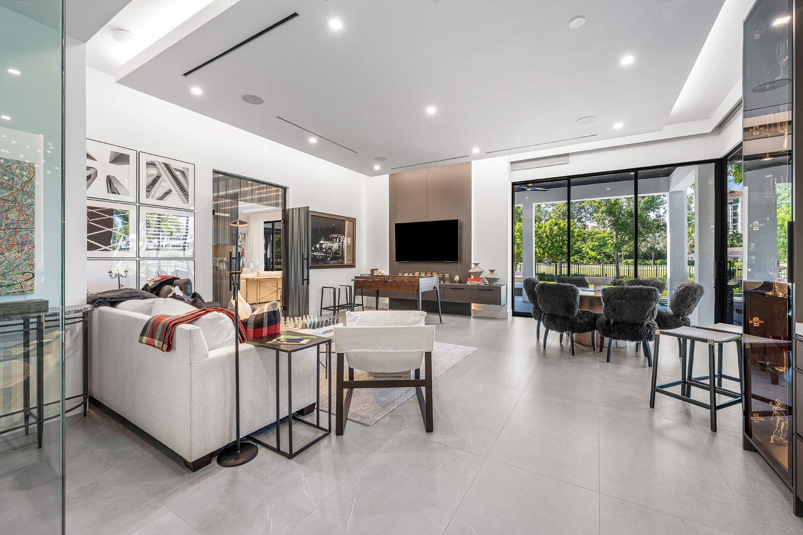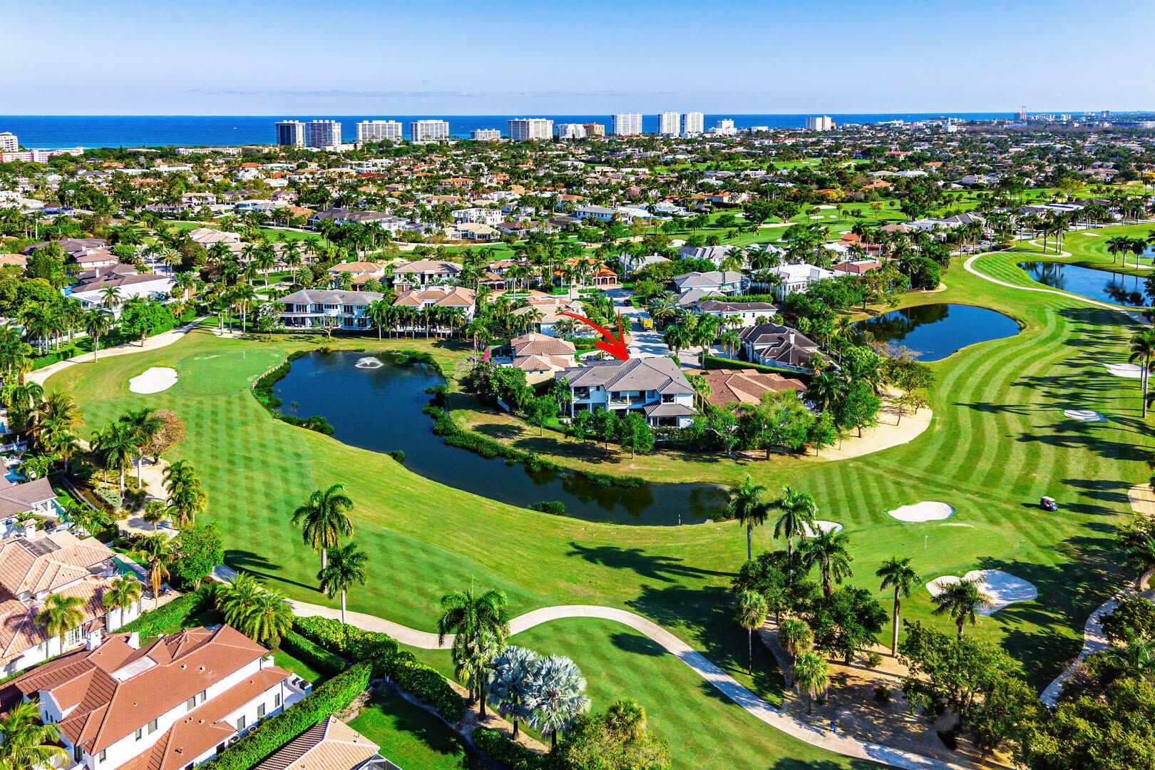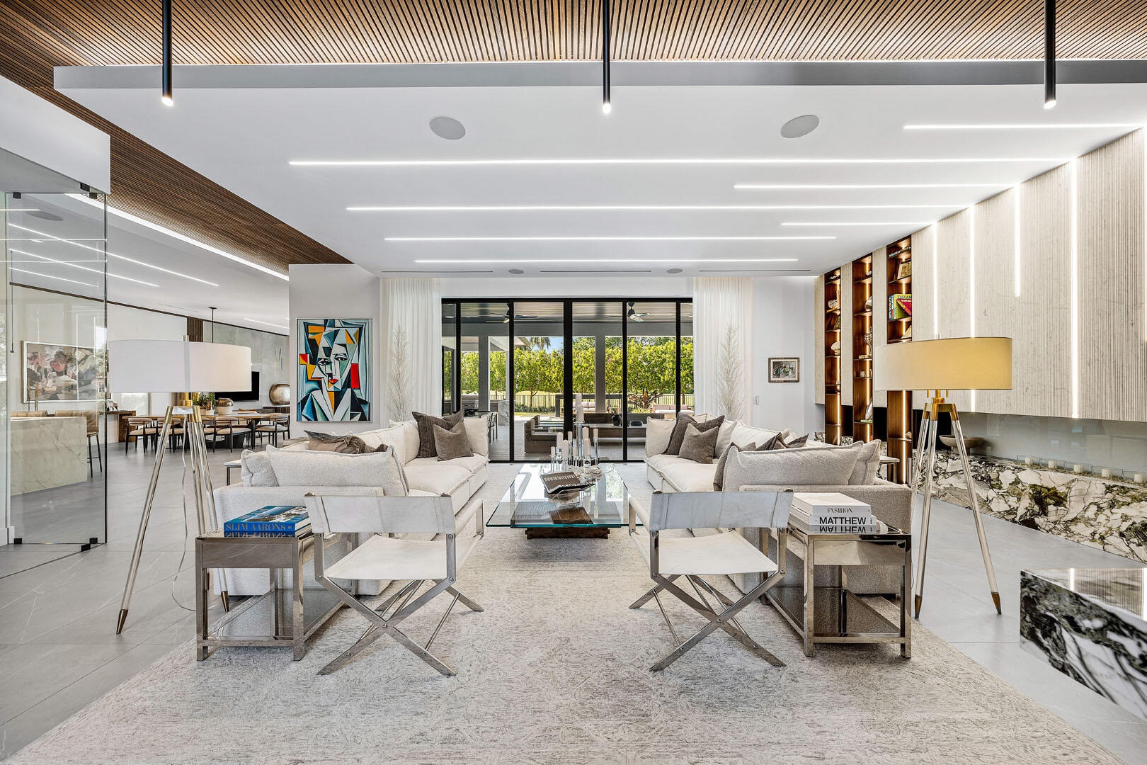 Welcome to 117 Thatch Palm Cove, located on the quietest cul-de-sac street in the prestigious Royal Palm Yacht & Country Club. Built in 2023 by Primo Construction, this golf course estate offers 165 feet of prime golf frontage with sweeping views of a serene pond and the Jack Nicklaus signature golf course, and features over 7,700 square feet of luxurious living space with 5 bedrooms, 6 baths, and a club room. Floor-to-ceiling glass brings in ample natural light and perfectly frames the tranquil water and golf views, creating a seamless connection between the chef's kitchen, family room, great room, and the resort-style outdoor area with heated pool, spa, covered seating, and lush landscaping. Additional highlights include a private putting green, full-house generator, and a three-car garage, one of which is an incredible show garage designed to showcase a prized automobile.