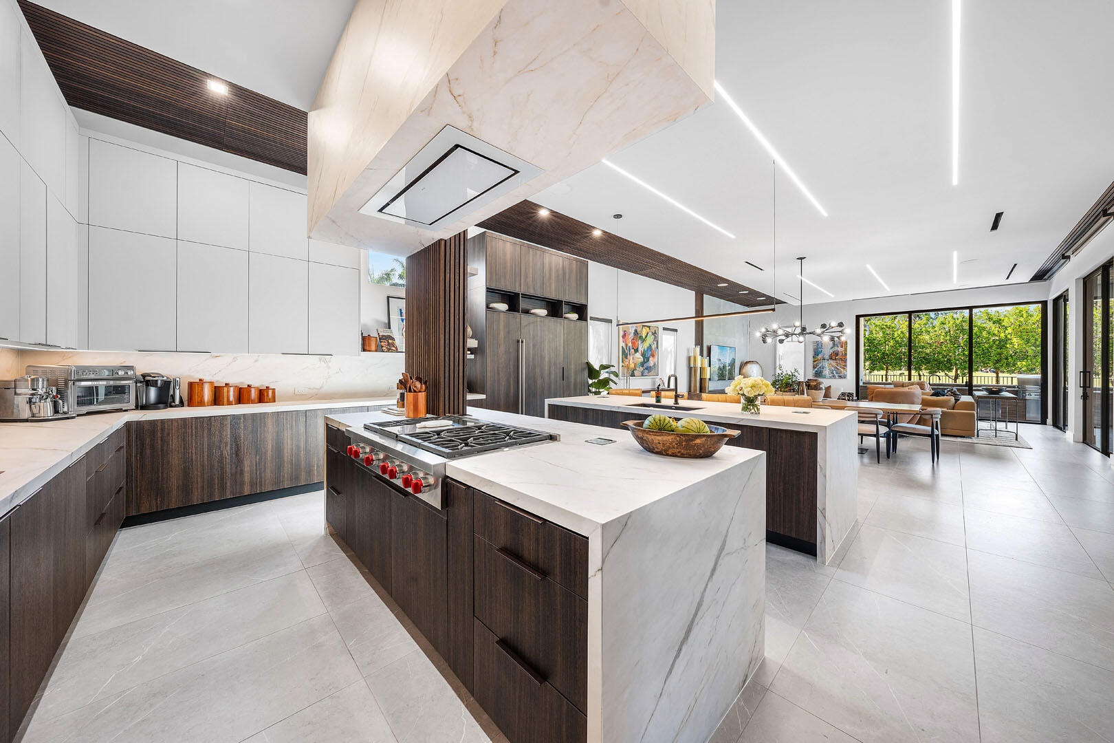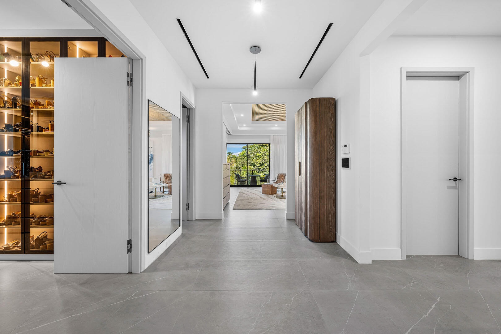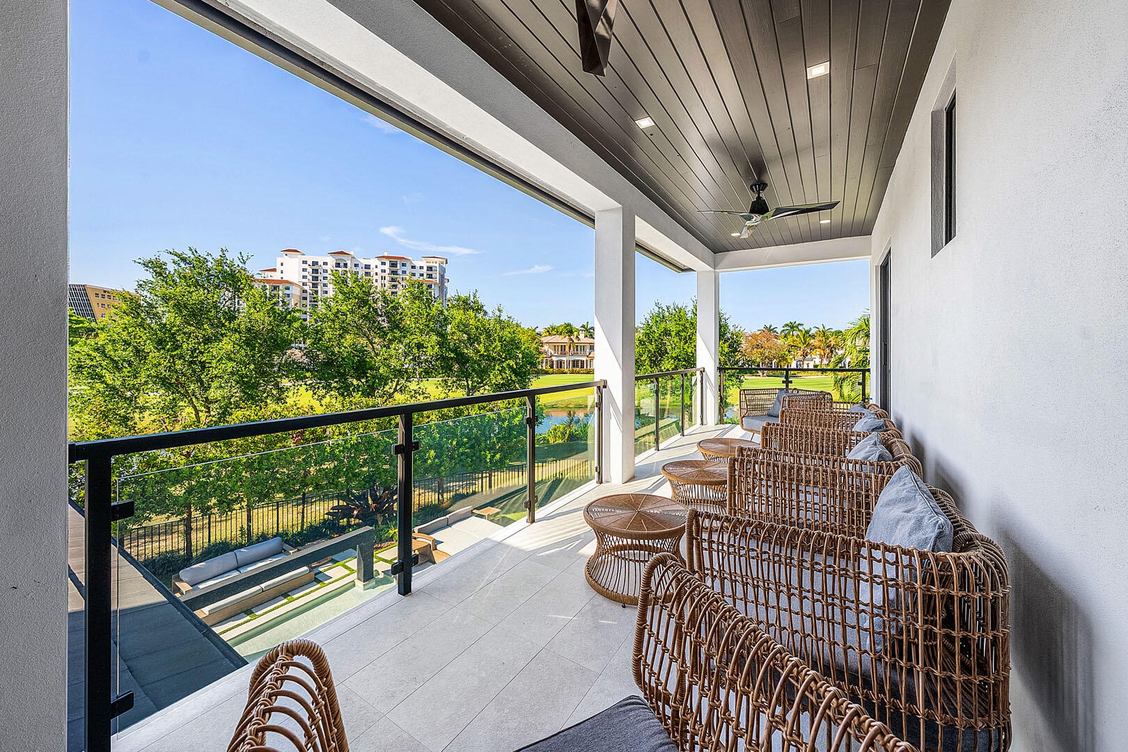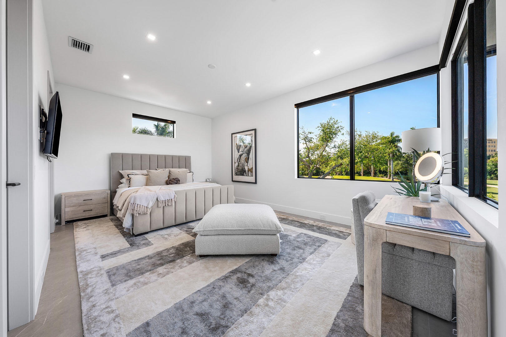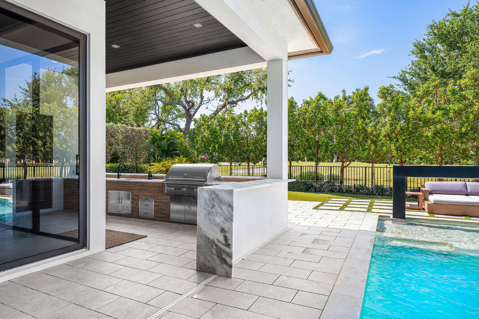 Welcome to 117 Thatch Palm Cove, located on the quietest cul-de-sac street in the prestigious Royal Palm Yacht & Country Club. Built in 2023 by Primo Construction, this golf course estate offers 165 feet of prime golf frontage with sweeping views of a serene pond and the Jack Nicklaus signature golf course, and features over 7,700 square feet of luxurious living space with 5 bedrooms, 6 baths, and a club room. Floor-to-ceiling glass brings in ample natural light and perfectly frames the tranquil water and golf views, creating a seamless connection between the chef's kitchen, family room, great room, and the resort-style outdoor area with heated pool, spa, covered seating, and lush landscaping. Additional highlights include a private putting green, full-house generator, and a three-car garage, one of which is an incredible show garage designed to showcase a prized automobile.